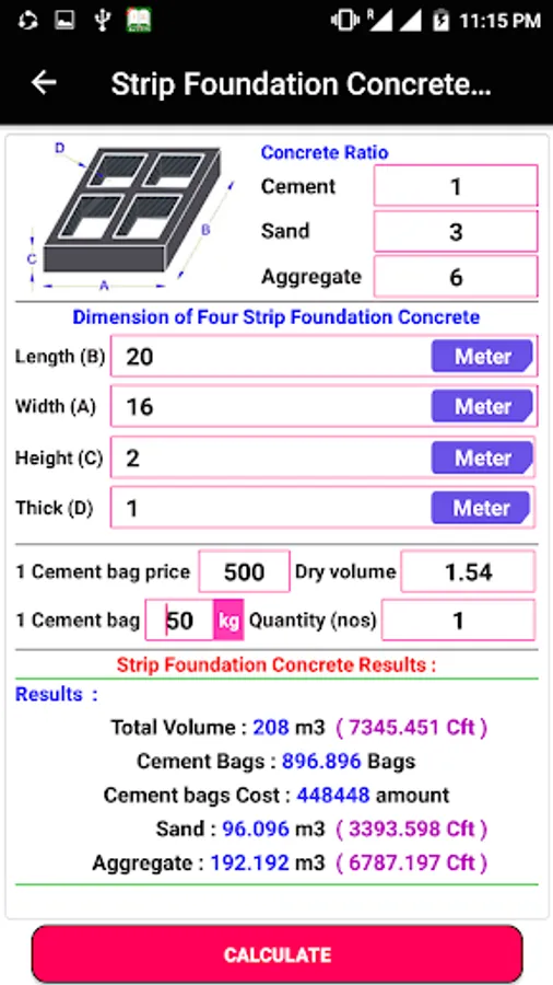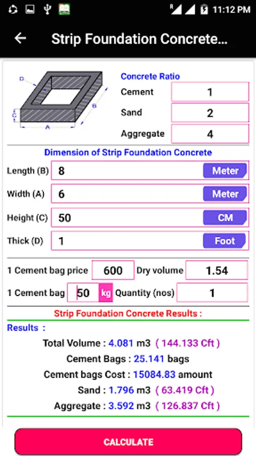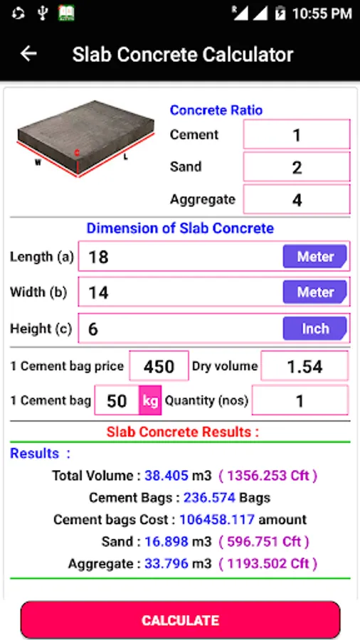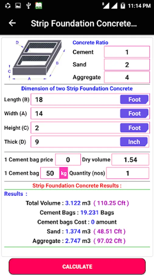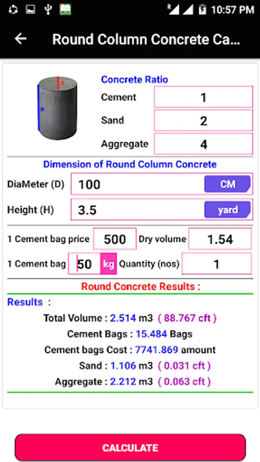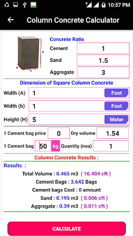 Builder Calculator pro - Concrete Volume Calculator is a simple tool to calculate volume of footings, slab, square column, round column, and steel weight. It also calculate total cost and quantity of concrete needed for construction of footings, slab, square column and round column.