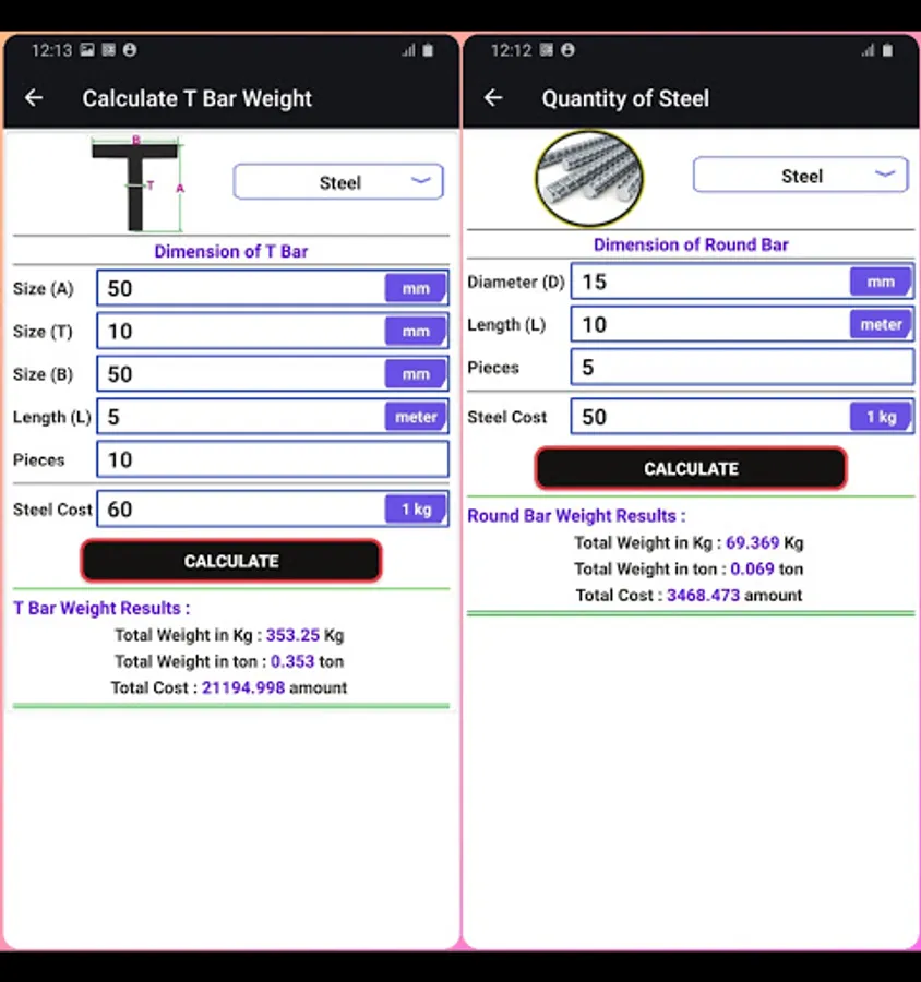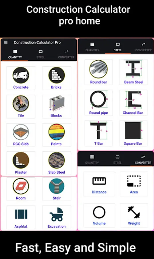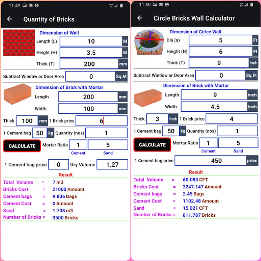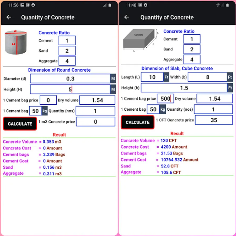Construction Calculator pro is a simple tool to calculate quantity of bricks, concrete, cement, sand, aggregate, concrete blocks, slab concrete, square column concrete, round column concrete, tiles, round steel weight, paint, rcc slab, rcc column etc. and also calculate all shapes area.