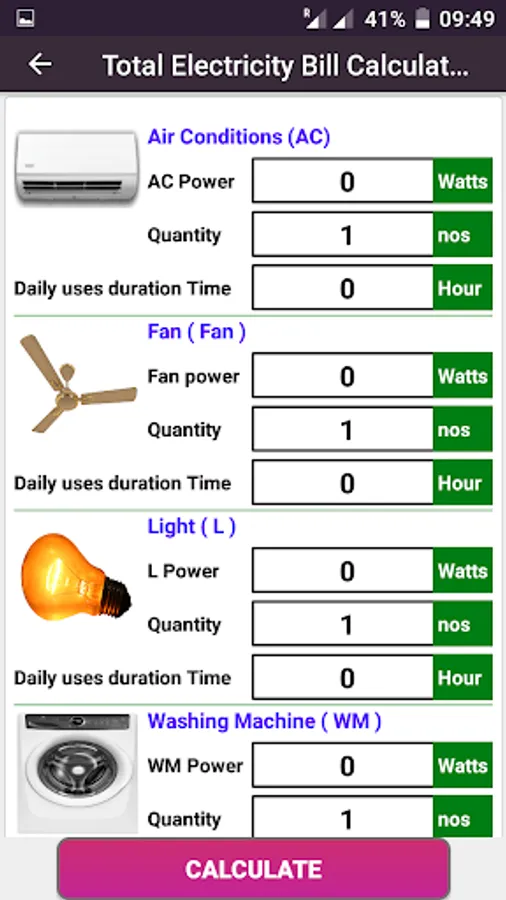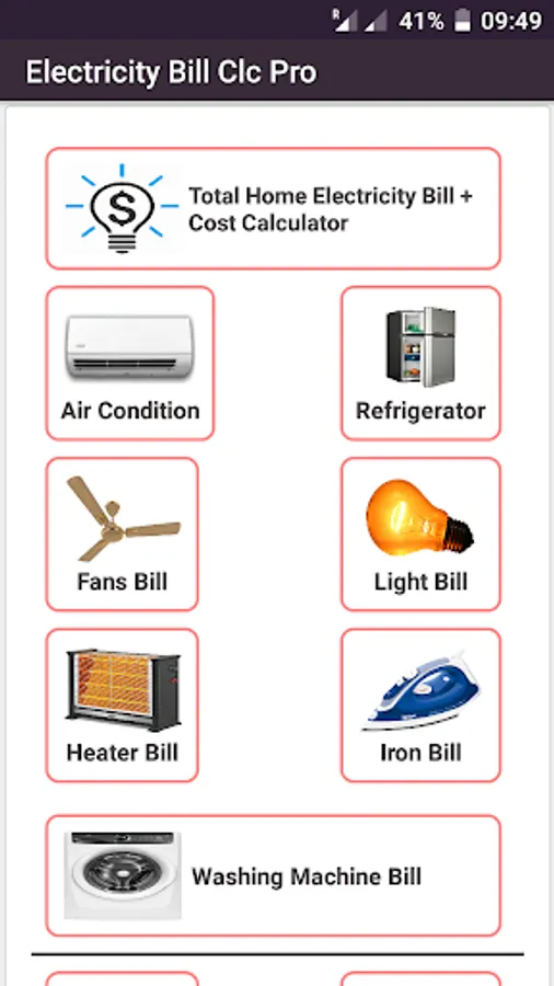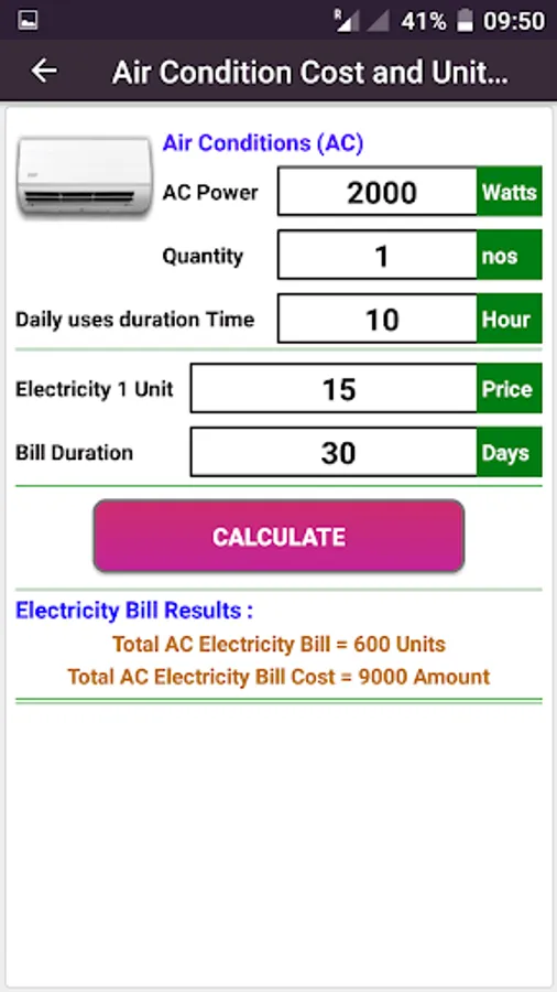 Calculate Electricity Units and Cost of Air Conditions, Refrigerator,.Fans, Light, Heater, Iron, Washing Machine and Total Home Bill Cost + Units.
