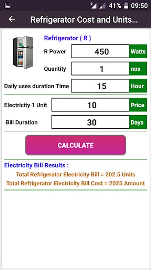You can calculate Quantity of Refrigerator Consumption Electricity Units and Units Cost With Daily hours basis.