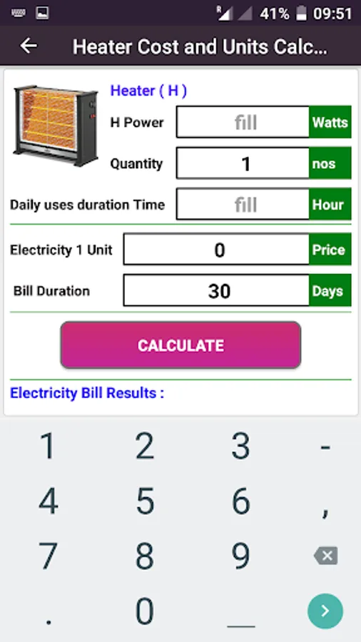 You can calculate Quantity of Heater Consumption Electricity Units and Units Cost With Daily hours basis.