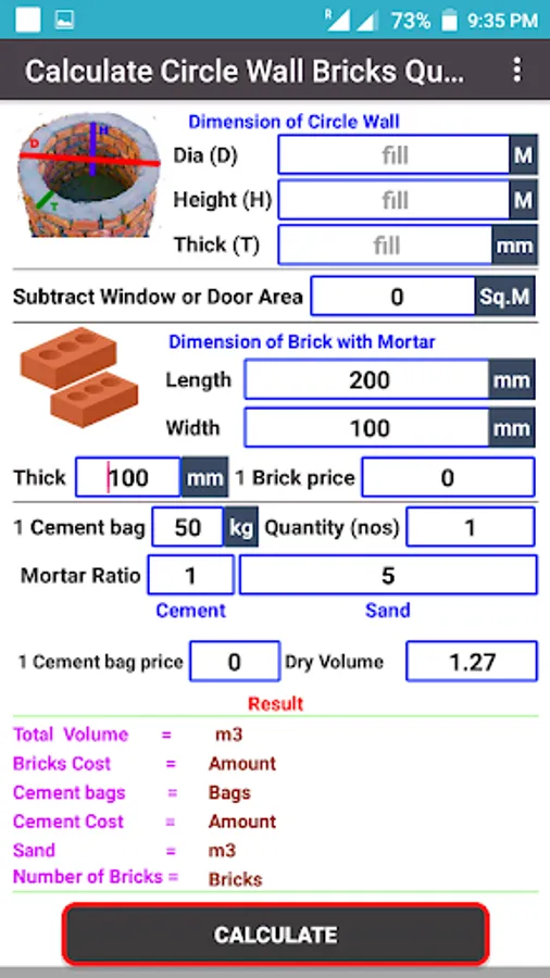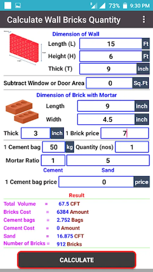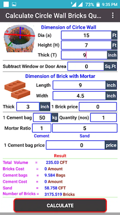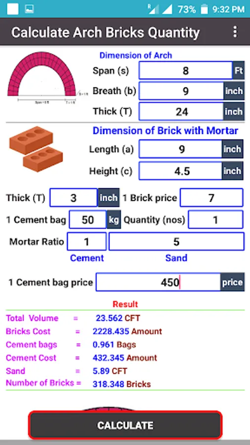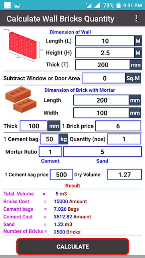 • Calculate Bricks Mortar Quantity + Cement Bags and Sand.