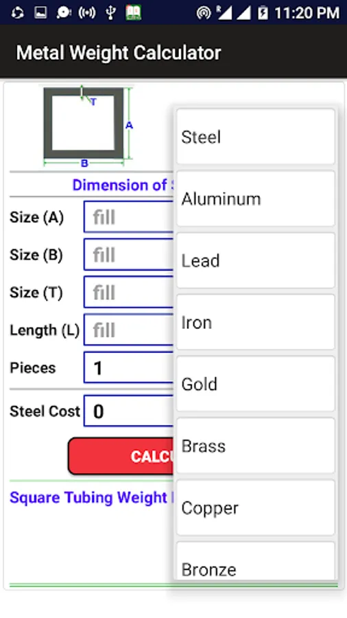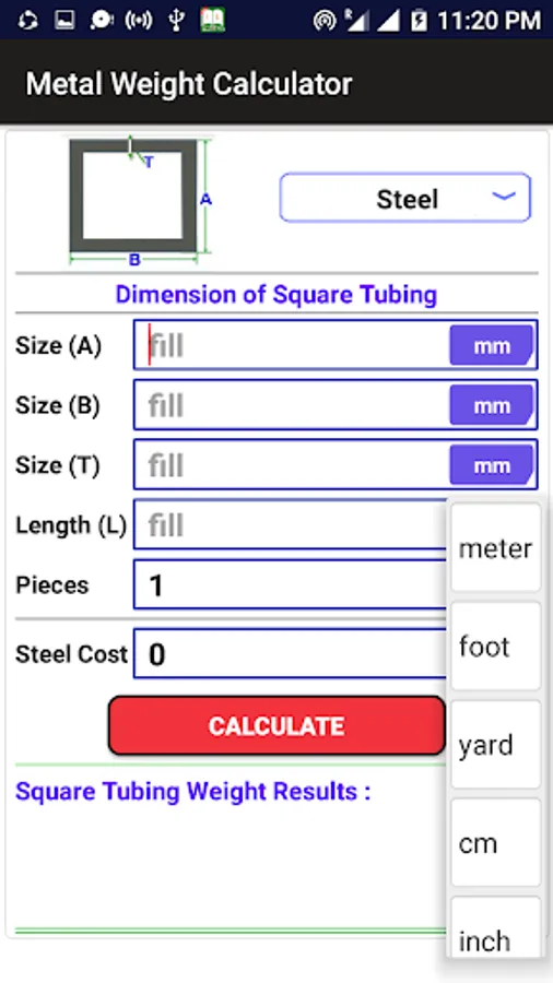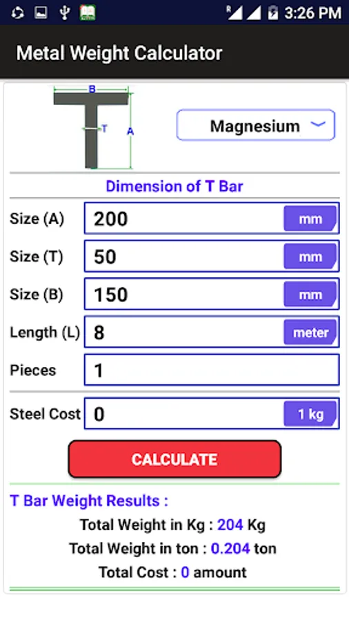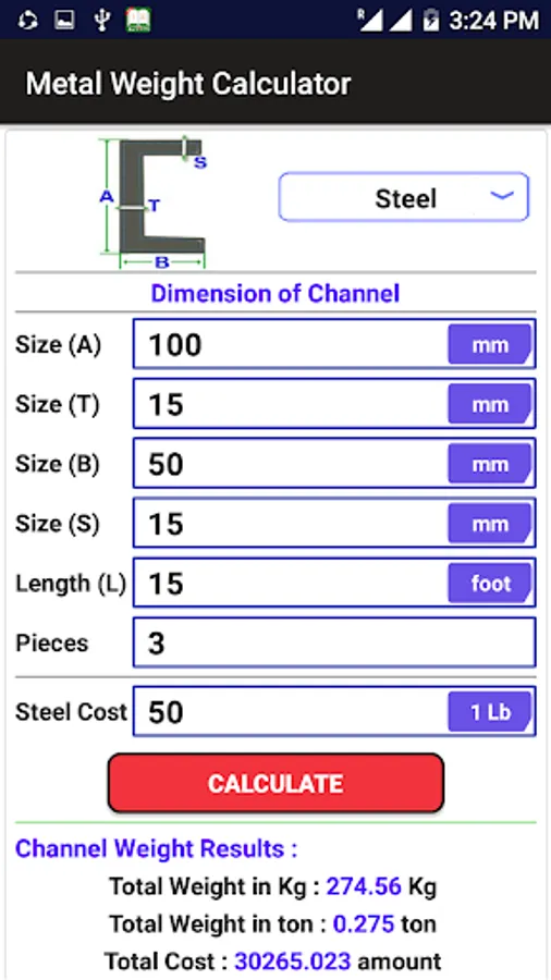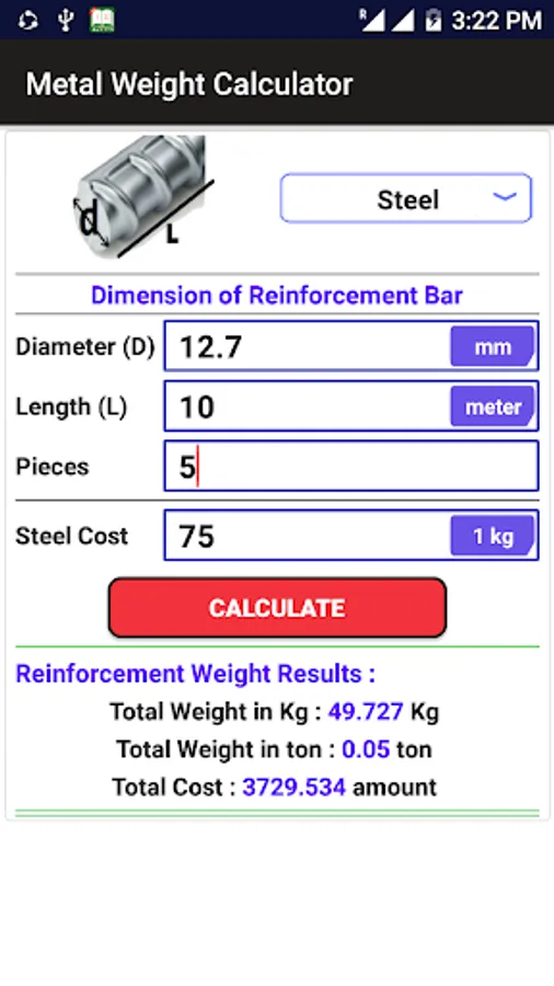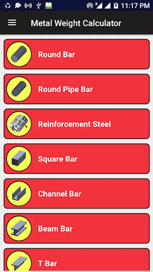 You can use this app for all known metal forms or Standards; Round Bar, Round pipe bar, Reinforcement Steel, Square bar, Channel Bar, Beam bar, T bar, Square, Tubing bar, Sheet Bar, Angle bar and Flat Bar.