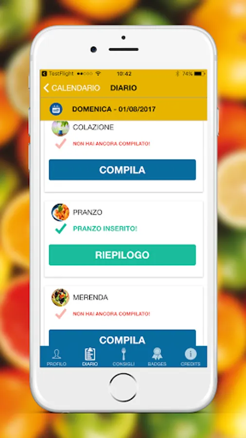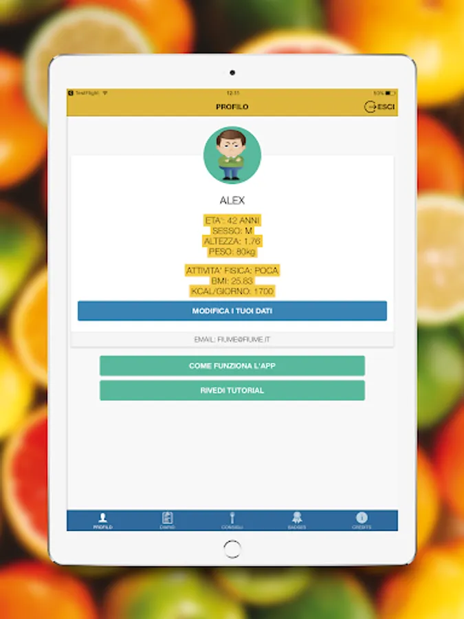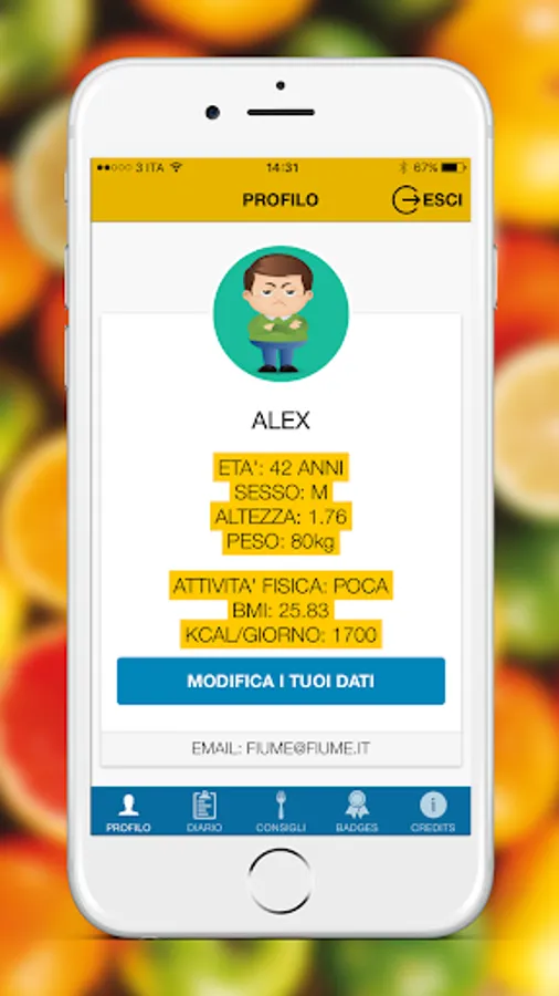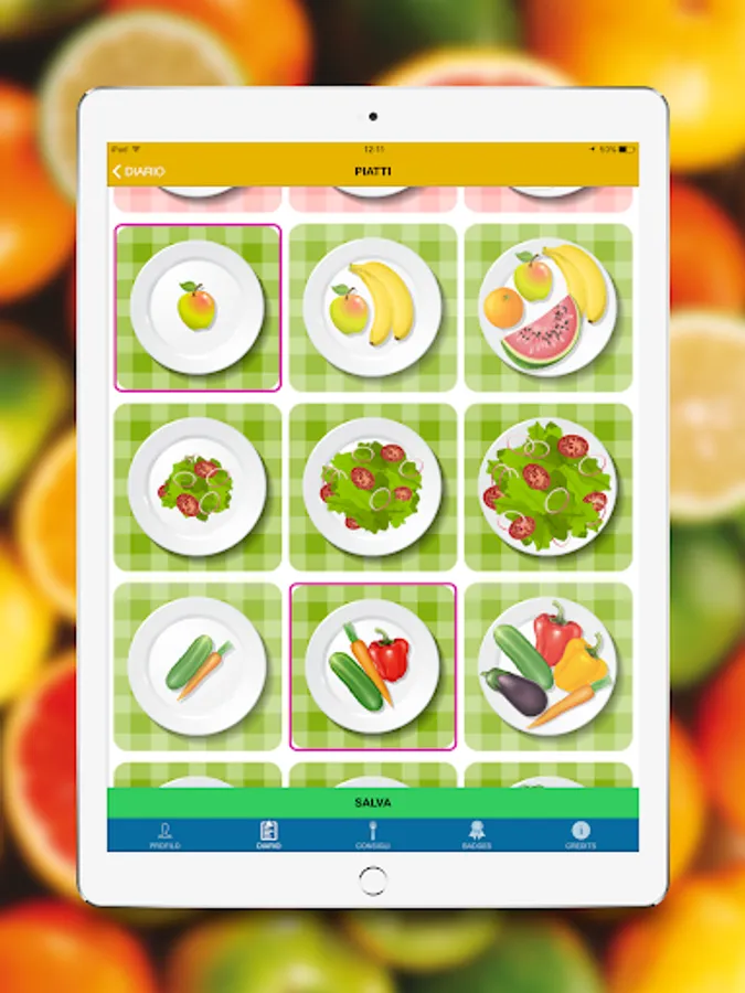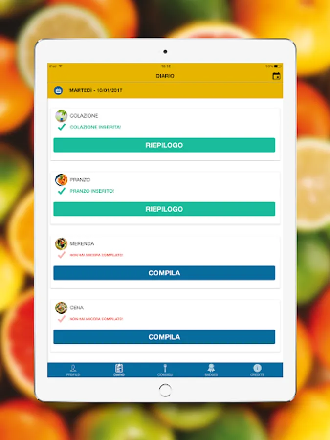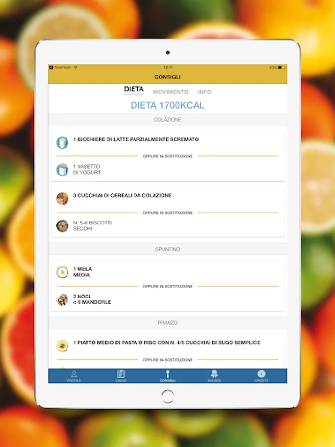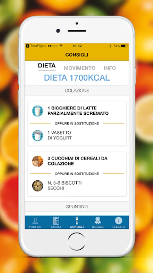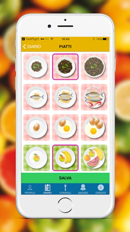 In the app, a character will give you some simple tips on how to eat and live healthily. You will find a personalized daily menu, tips on what to eat during the week, you can also indicate if you do physical activities, to store your weight and mark any changes.