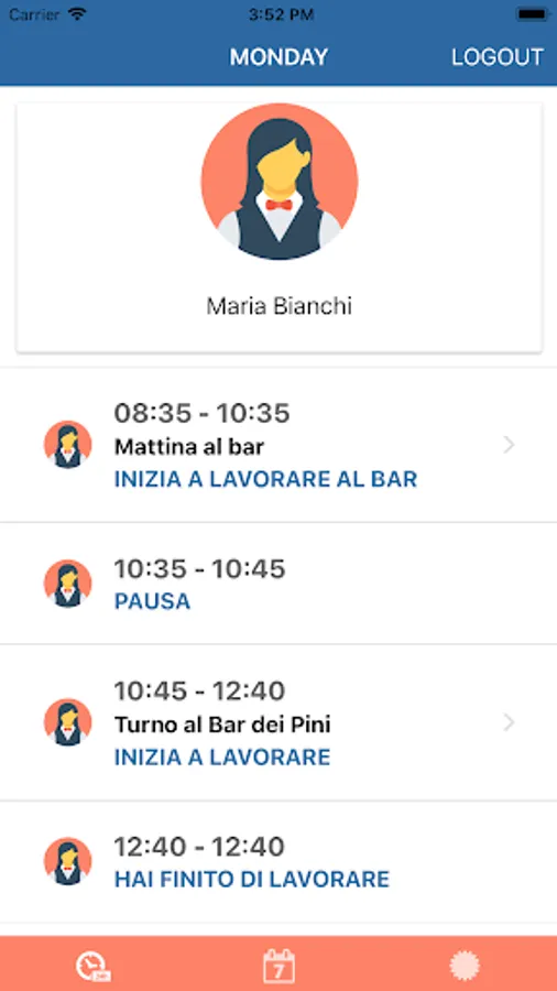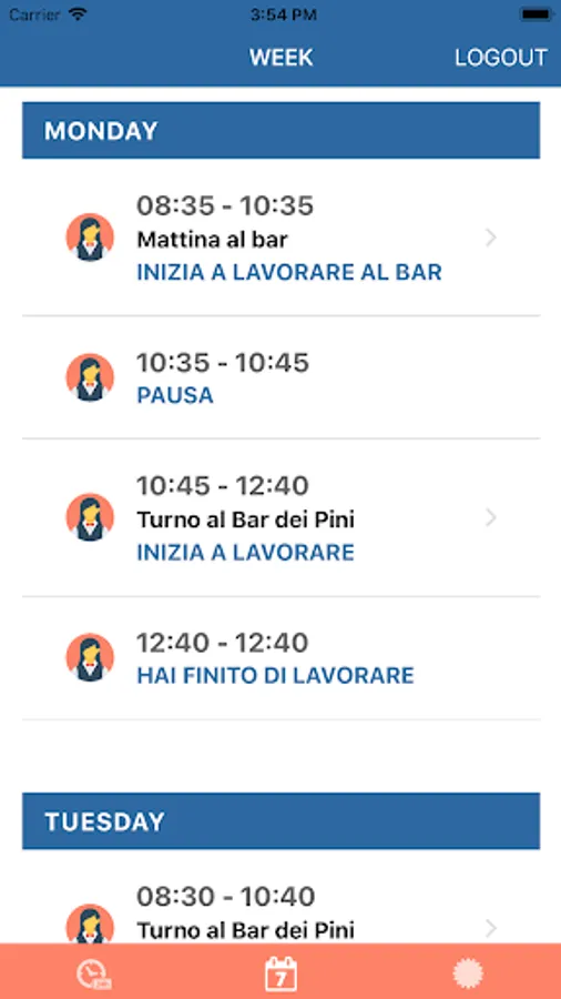 - daily agenda: day of the week, task to be performed and time of your shift, with the option to set alarm-notification