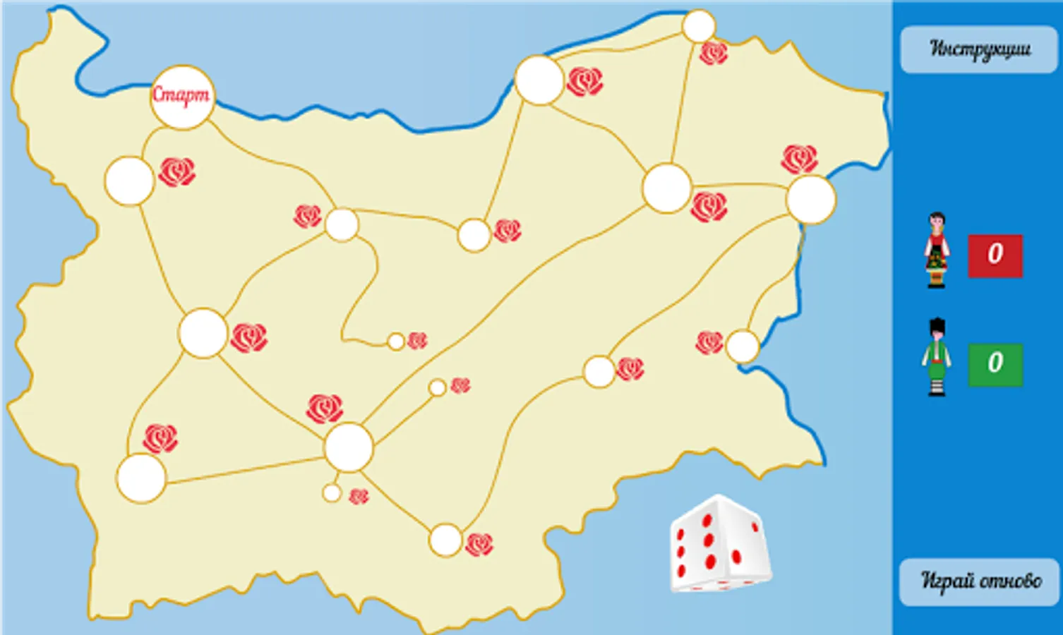 The game is played with two teams and each team selects the man with which to play. Press on the dice. The little man moves so moves as showing dice. Pressing the rose, which is near the place where you left appears task that must decide. If you choose whole task correctly, the rose will disappear. For each correct answer get points. Players of both teams alternate. The game ends when all the roses disappear, or at the request of participants. Wins the team with the most points.