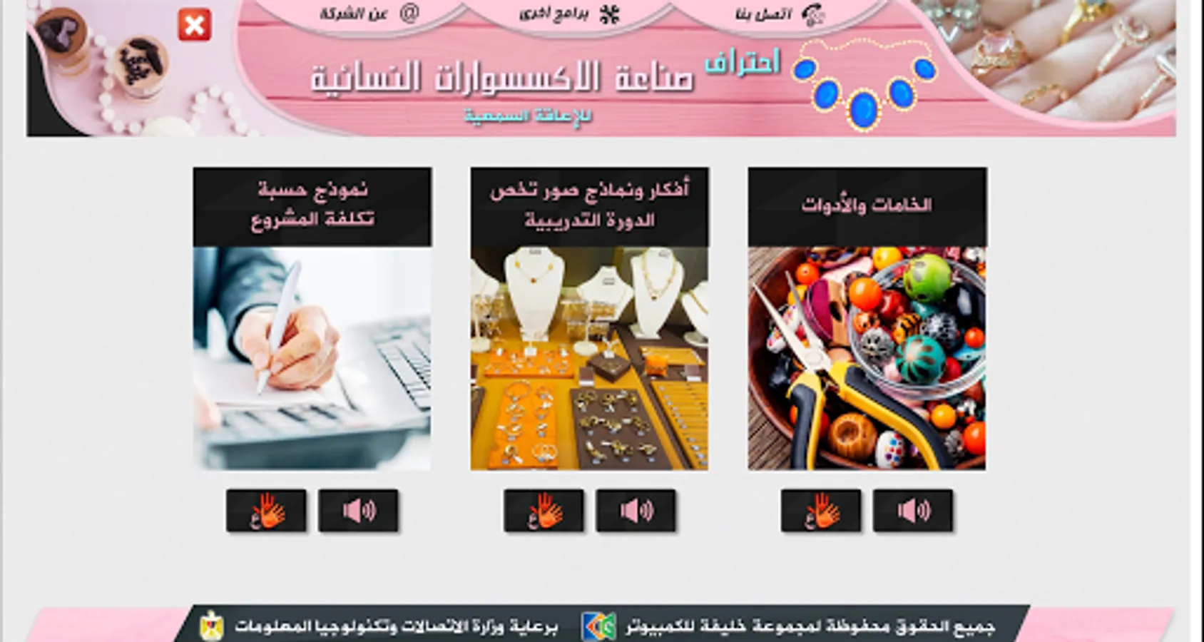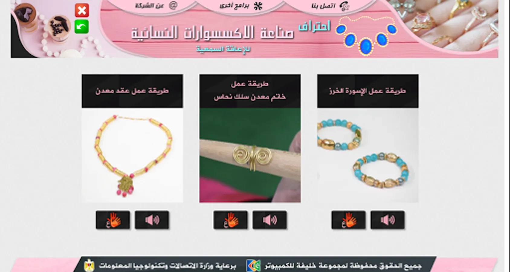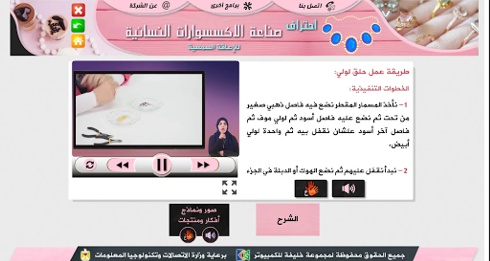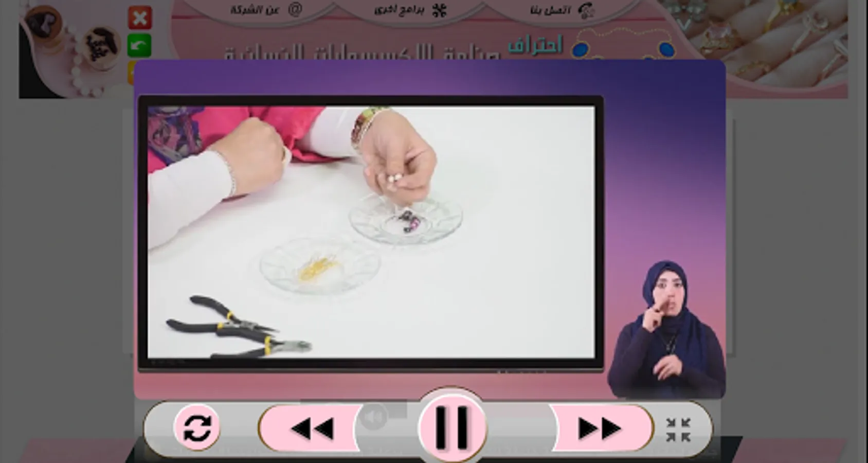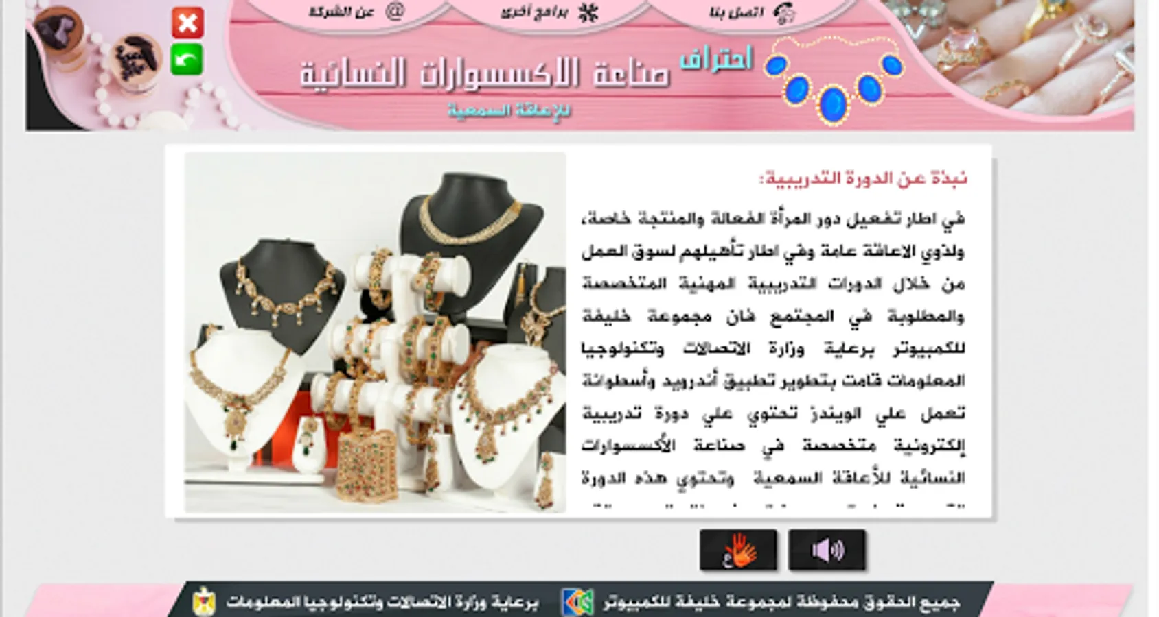 The application is a specialized training course (self-education) to teach the basics of making women's accessories (earrings - necklace - bracelets - rings) by giving an overview of each item, the tools used, and videos explaining the numbers and industry method combined with the sign and sound languages.
