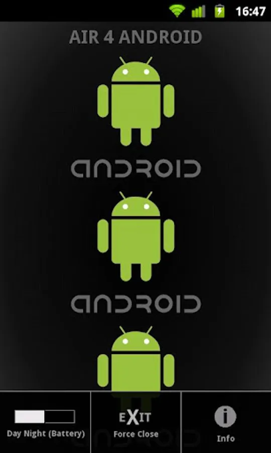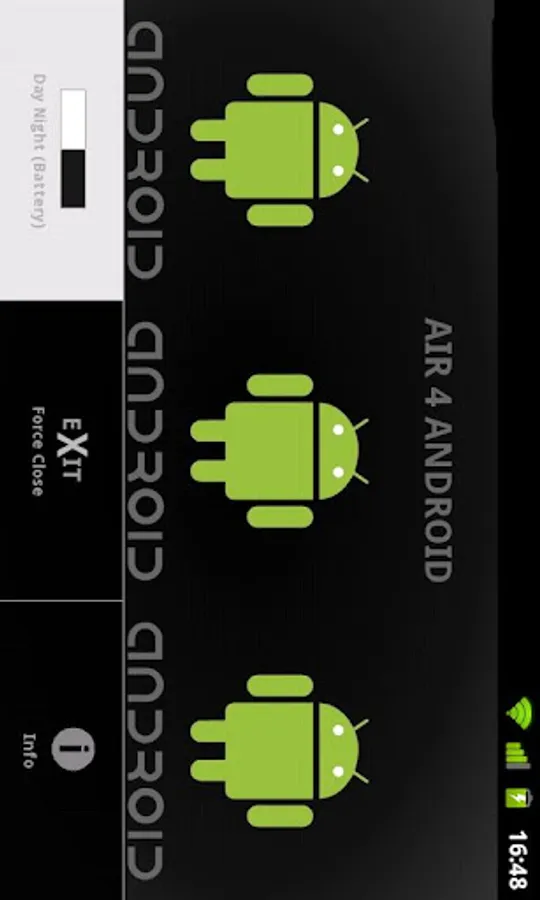Features: Android System look alike Menu (emulation), Stage orientation landscape and portrait support (with 3D transition), (auto)fits any screen resolution (optimized for 800x480 and up - tablet), force close of app, store user settings as 'SharedObject', info popUp (emulation) ... night (eye and battery friendly) and day mode (black and white)