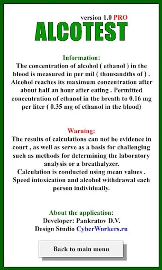 Appendix "AlcoTest Pro" will be extremely useful not only for motorists but also to all those who sometimes consume alcoholic beverages. "AlcoTest Pro" will help to know how much you're actually drunk, can we now get behind the wheel or even worth the wait.