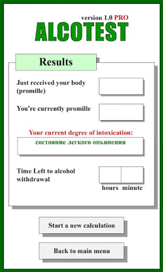 The results of calculations can not be evidence in court, as well as serve as a basis for challenging such as methods for determining the laboratory analysis or breathalyzer device. Calculation is conducted using mean values. Remember that the speed of intoxication and withdrawal of alcohol from the body of each person individually.
