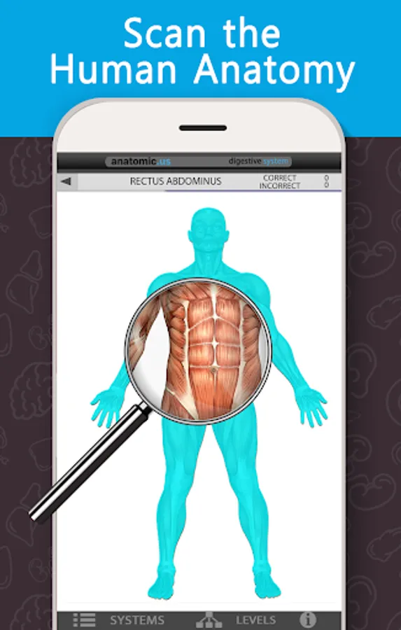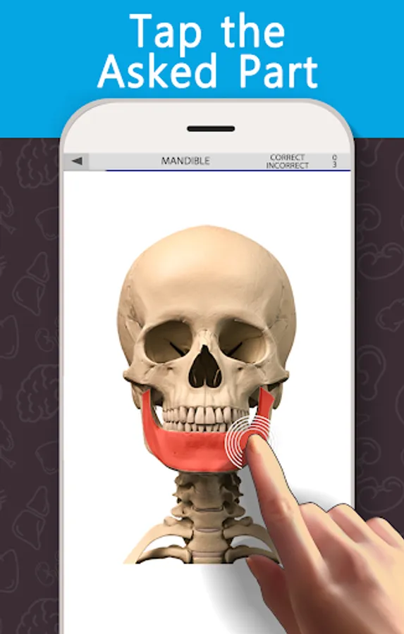 You have different body parts for every human system on the game. Choose one of them. At the beginning on the levels, there is a colored anatomy system about the part you chose. It has names of internal organs, bones, nervous etc. Keep it on your mind, and start the game. You will answer the asked question about it. You can answer the question by touching or scanning, but to unlock the scan feature, you must answer %50 of the questions correct. Time is limited, so you should be fast when clicking on the region. To help you find, colour changes on the asked region. The regions that you cannot find in time are asked again.
