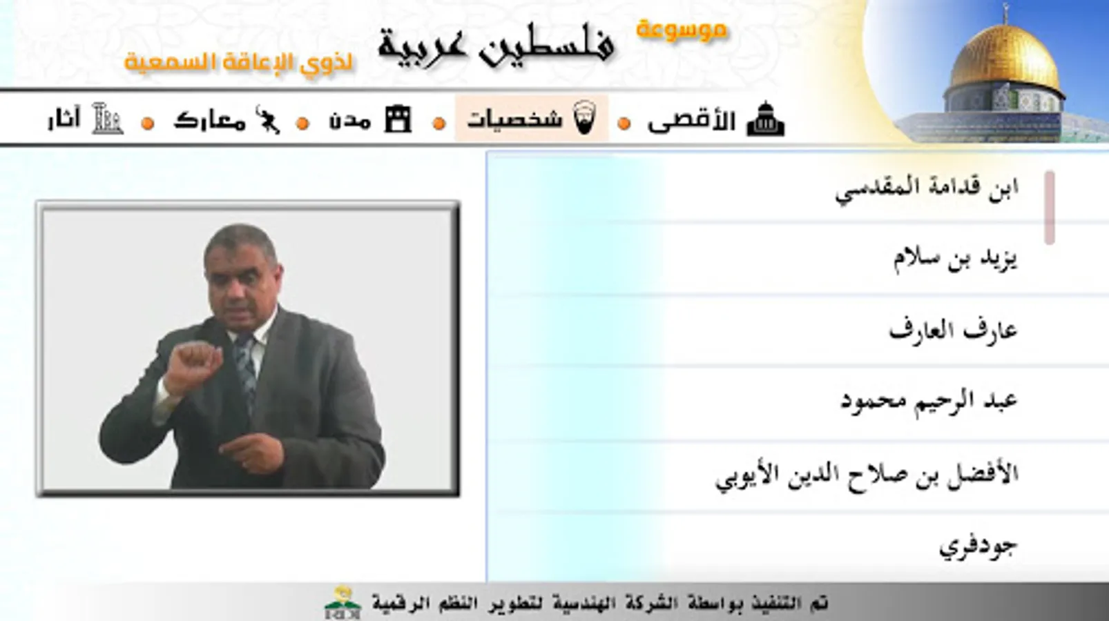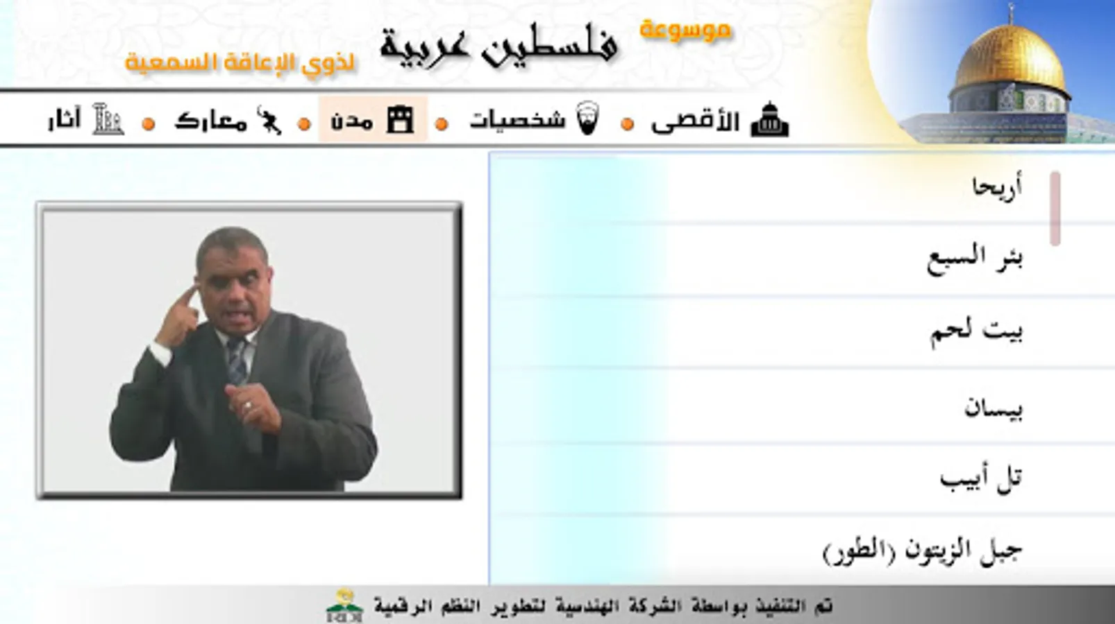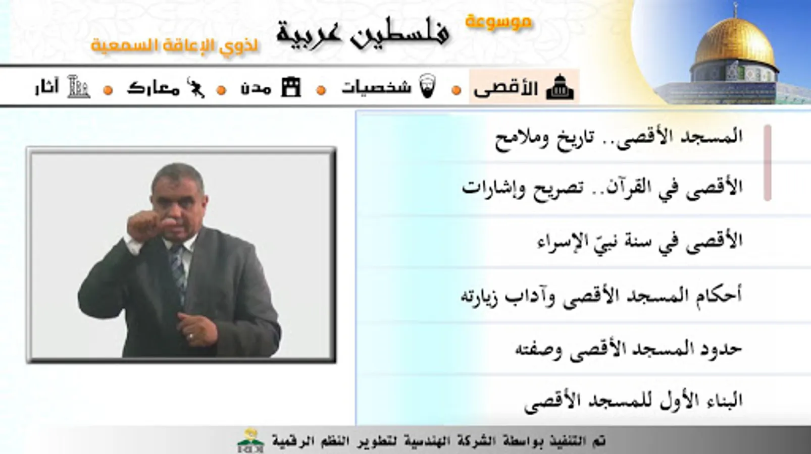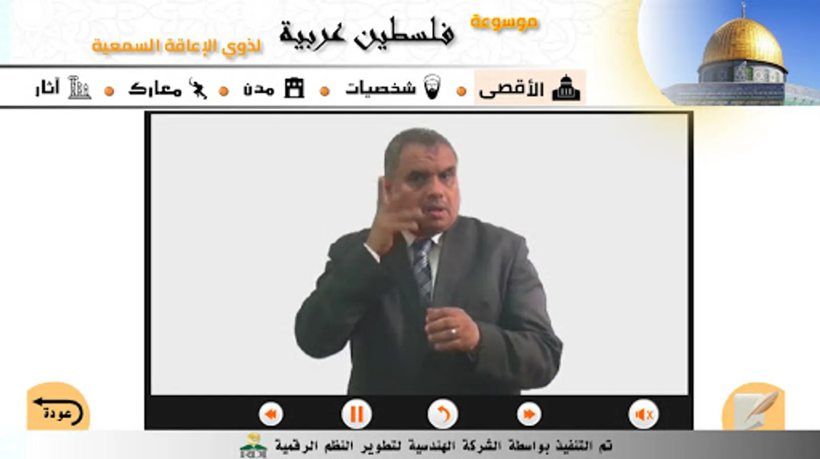 The definition of people with hearing disabilities in Palestine and its most important cities, personalities, battles, cultural features and Arab identity through the sign language accompanying the explanation of voice and texts in a simplified educational method based on documented historical and knowledge sources.