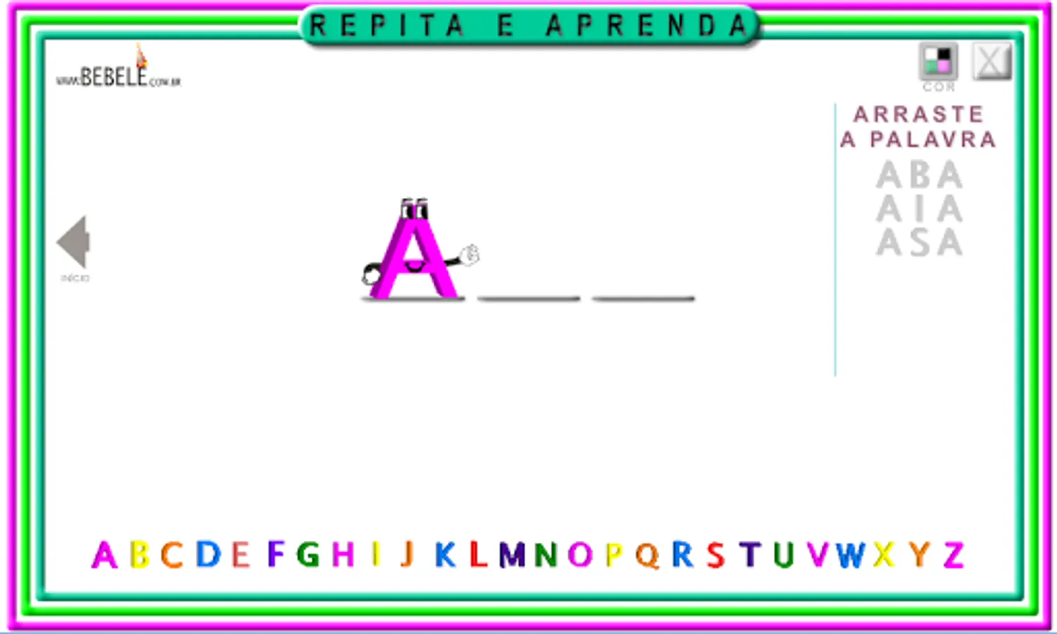 The child must pull one of these gray words to the center of the screen and complete it with the colored ABC letters found at the bottom of the screen.