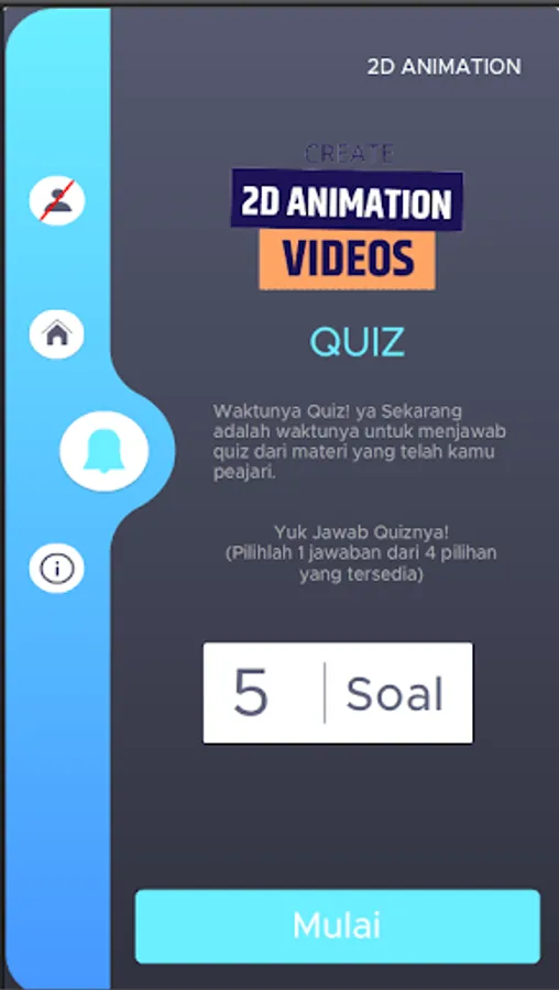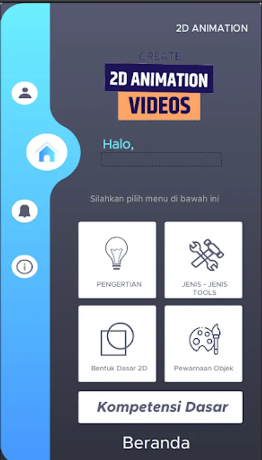 Belajar Animasi 2D adalah sebuah aplikasi pembelajaran animasi 2d untuk kelas 12. Terdapat berbagai menu yang bisa diakses dan mengandung materi pembelajaran, kompetensi dasar, dan latihan quiz. Yang bersifat interaktif dan dibuat dalam desain ui/ux yang berbeda dari aplikasi lainnya, jika dalam pembelajaran biasa akan terkesan bosan makan dengan aplikasi ini akan nyaman dan seru untuk melakukan pembelajaran.