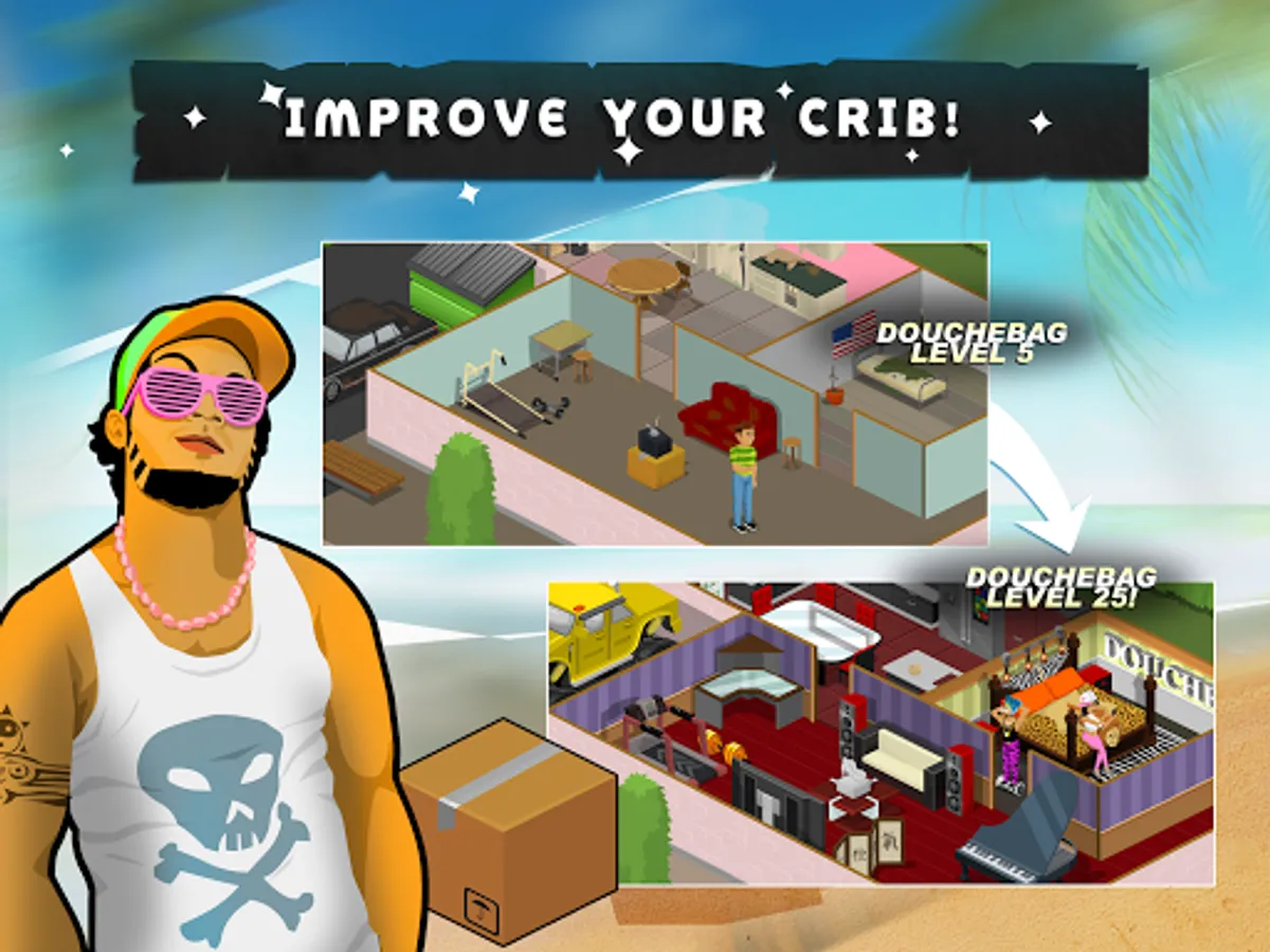 In your Douchebag quest you will have to train your muscles daily, drink protein shakes for energy, flirt and meet girls' interests, get ultra tanned, buy some cool clothes / fashion wear and customize your home. If you do all this right, you will increase your Douchebag level and get the most popular girls!