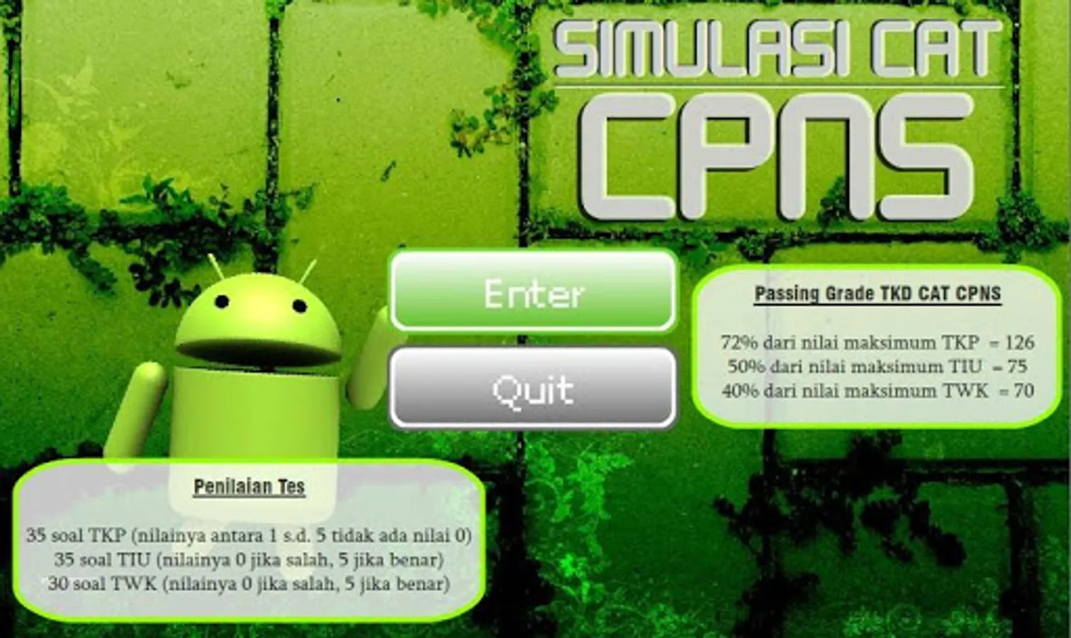 Aplikasi ini diprogram khusus bagi calon peserta CPNS karena memuat soal-soal sesuai kisi-kisi CPNS terupdate. Simulasi terdiri 3 subtes yaitu:
