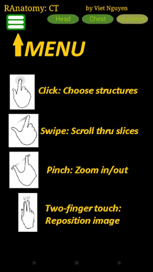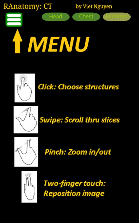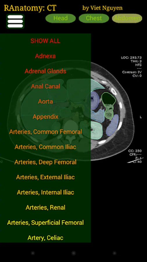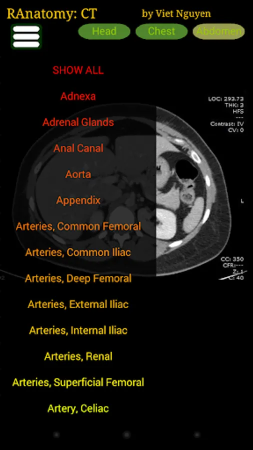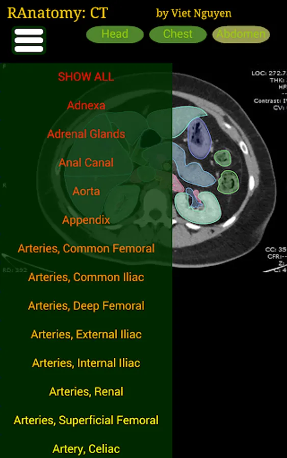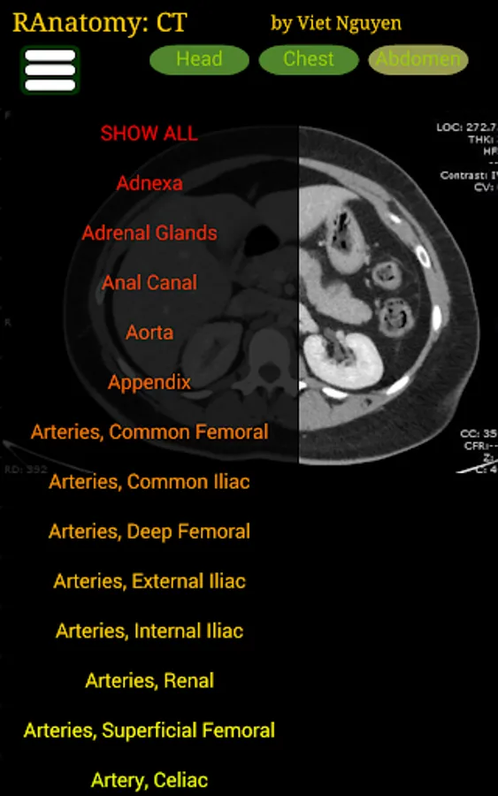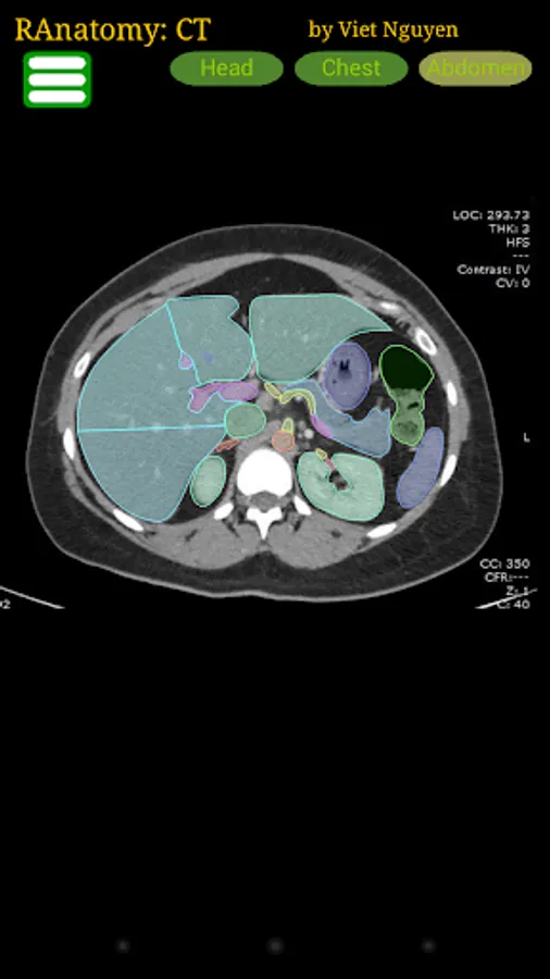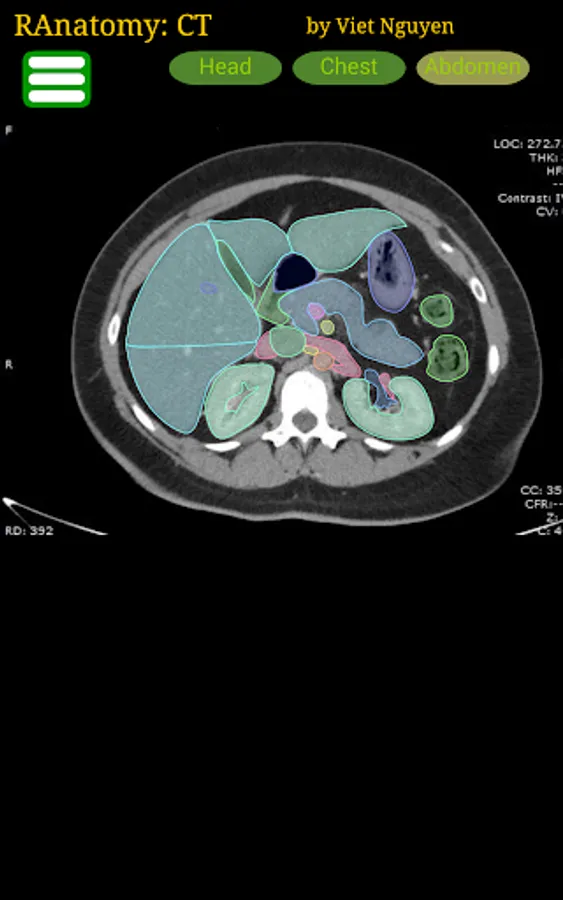 RAnatomy: CT provides a dynamic and interactive method of viewing cross-sectional human anatomy on computed tomography (CT). The information contained in this app cannot be guaranteed for completeness and accuracy. If errors are encountered, please contact me through my homepage.
