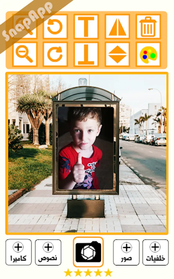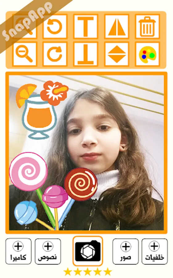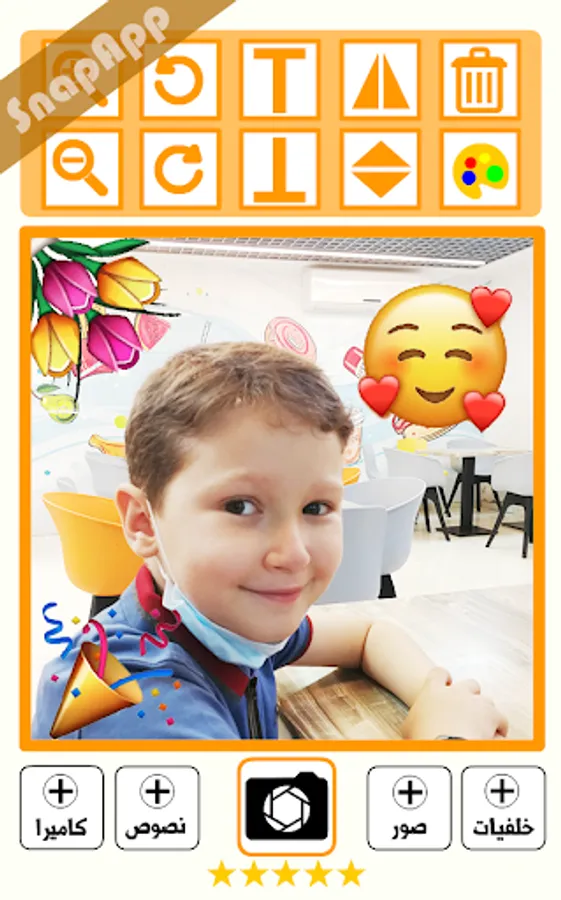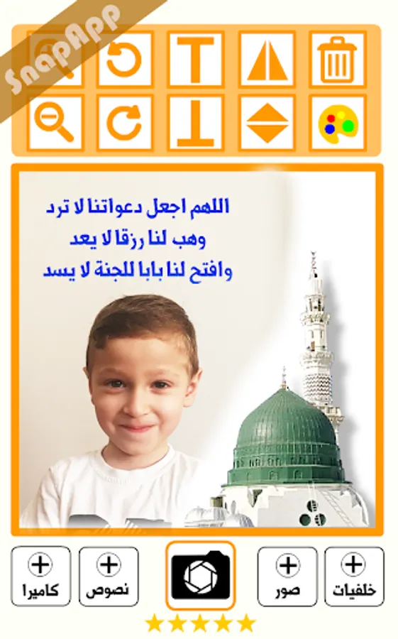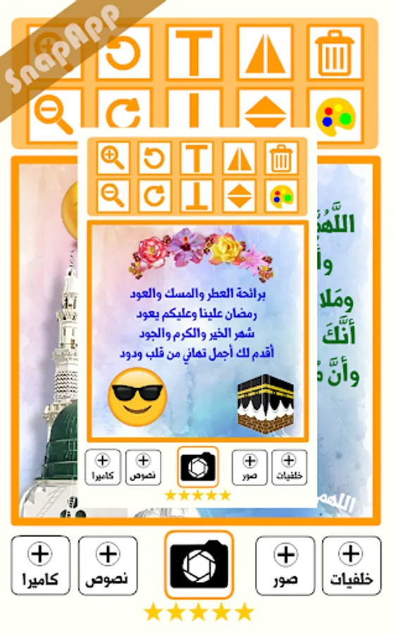SnapApp is a photography application with the front or back camera with various additions of background images, emoji, holograms, texts, morning and evening prayers, and phrases for various occasions such as Eid al-Fitr, Eid al-Adha, Mother's Day, or others. You can also design a general greeting card, a birthday greeting card, or a greeting card.