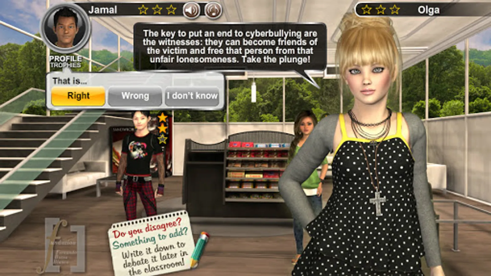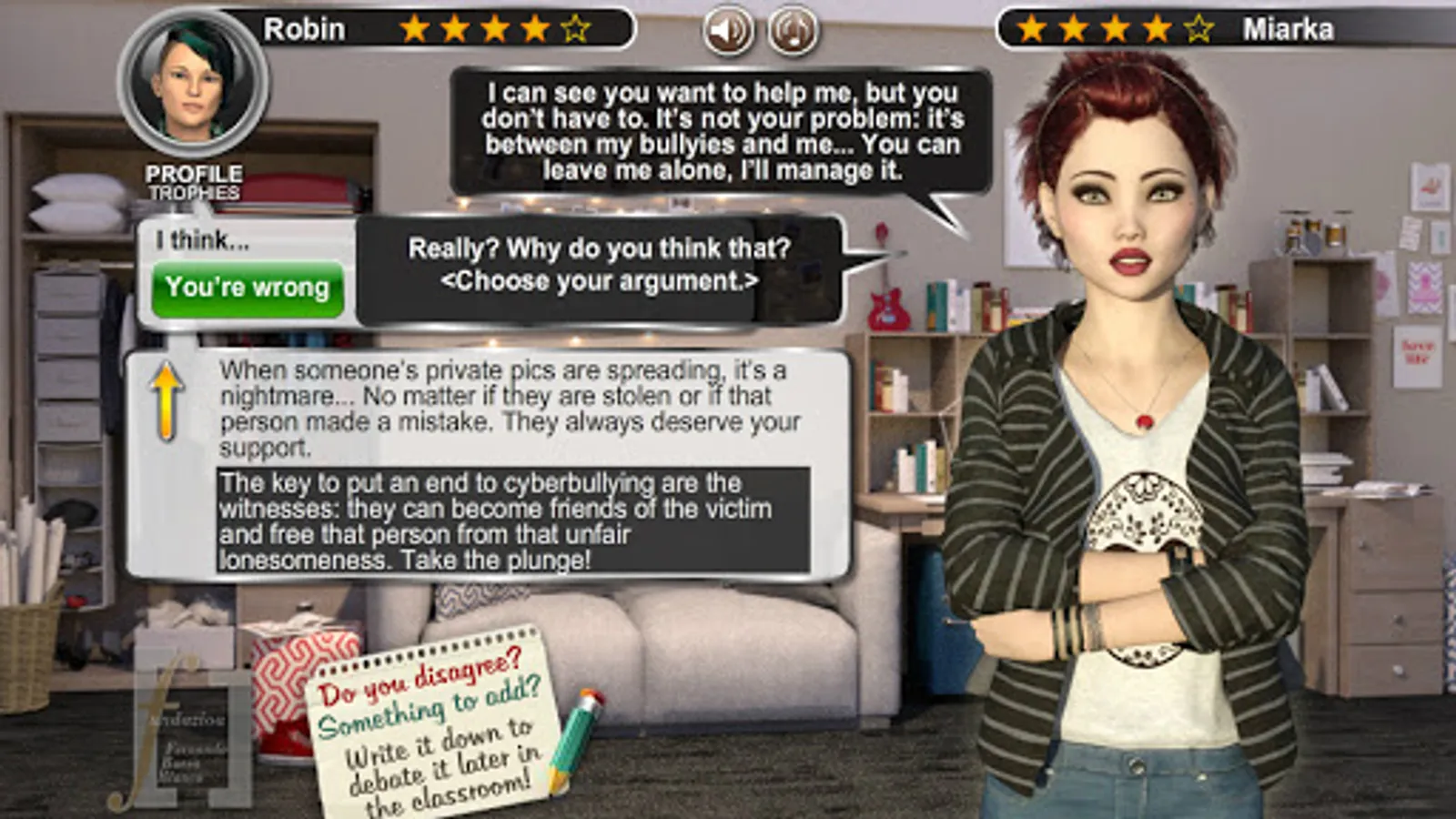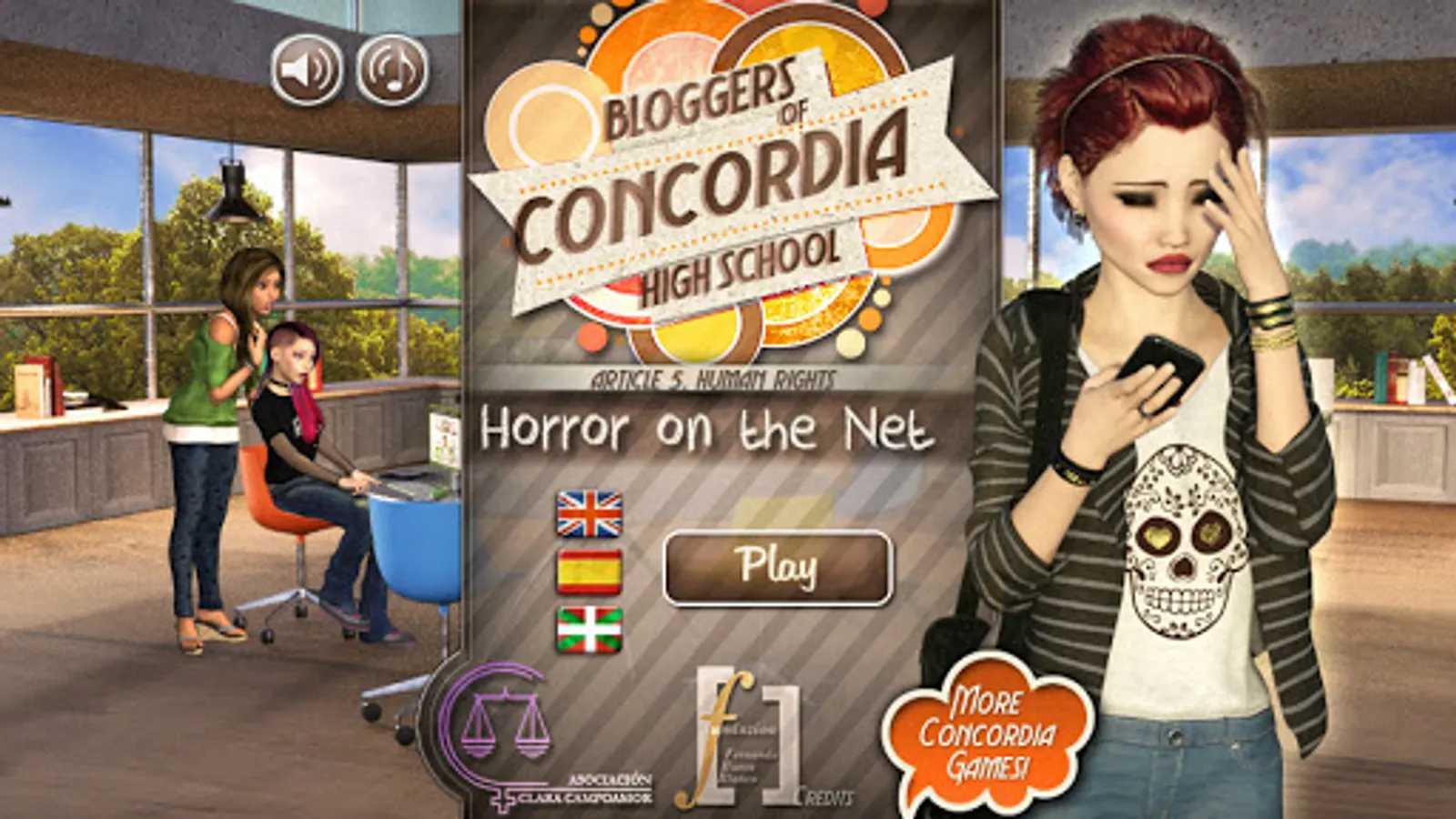 Horror on the Net. Article 5 Human Rights. Do you consider yourself neutral about cyberbullying? You can´t figure the way you could change the world if you take a step forward! Miarka´s life is a living hell and none seems to see it... Open your eyes! Will you leave her aside? Miarka just needs one person by her side: it´s you. Come to Concordia High School and join the adventure for Human Rights! Investigate all around the High School, solve hidden object games, find the lost pages and rebuild the puzzles. Discuss with the bloggers, get new arguments, find out all points of view, disagree... And don´t shut up!