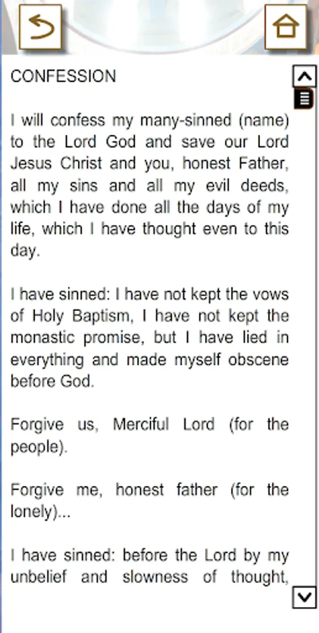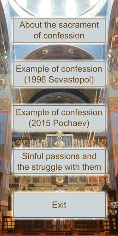 I would like to draw attention to the fact that the developer did not set himself the task of automating the process of preparing for the sacrament of Confession, but only to provide a guide for the self-preparation of the penitent for this sacrament. And that is why the application is created with a concise interface and minimal functionality that does not distract the user from the internal analysis and verification of his soul with the proposed examples of confession.