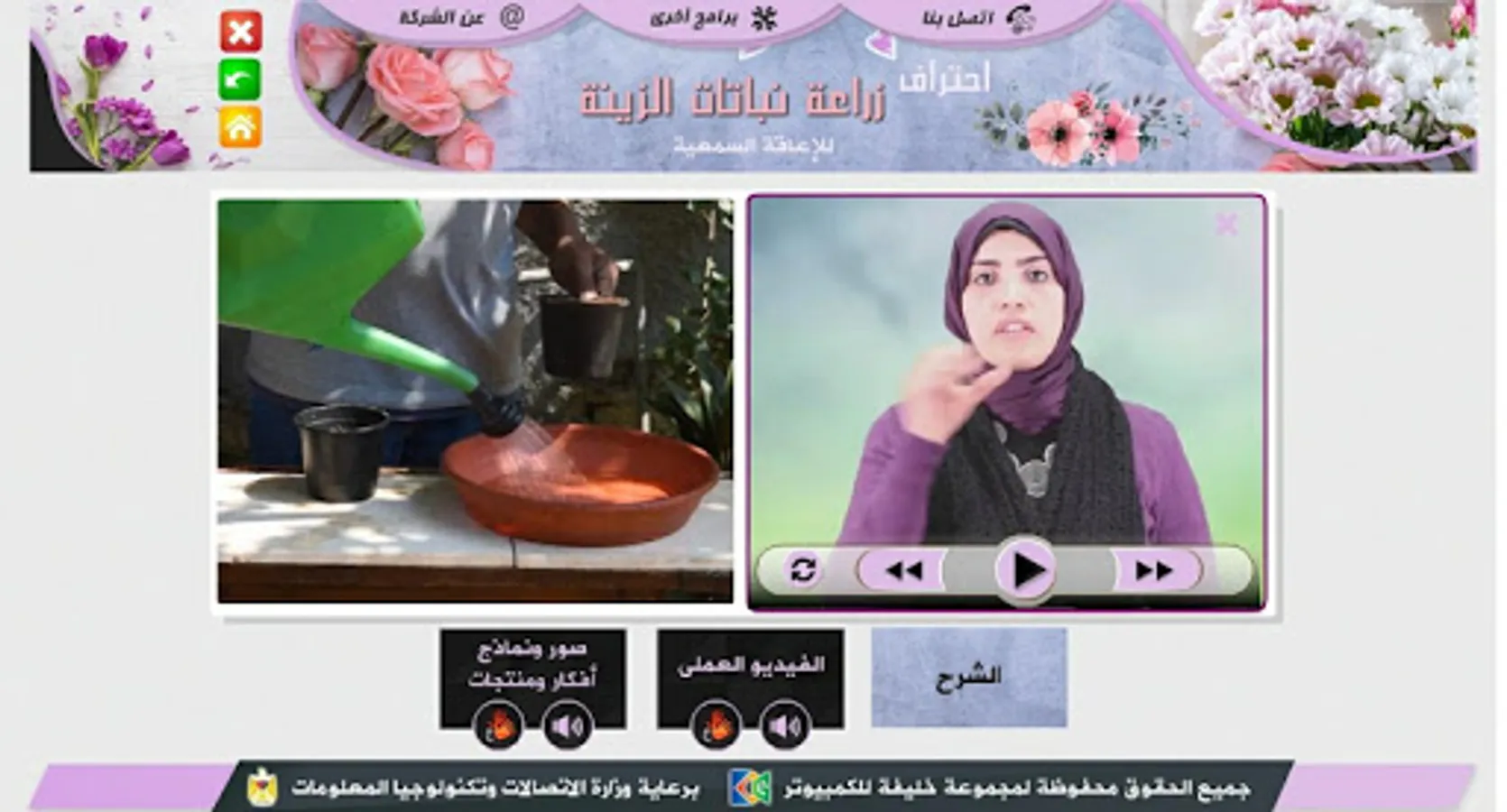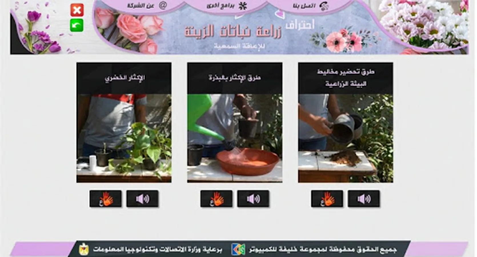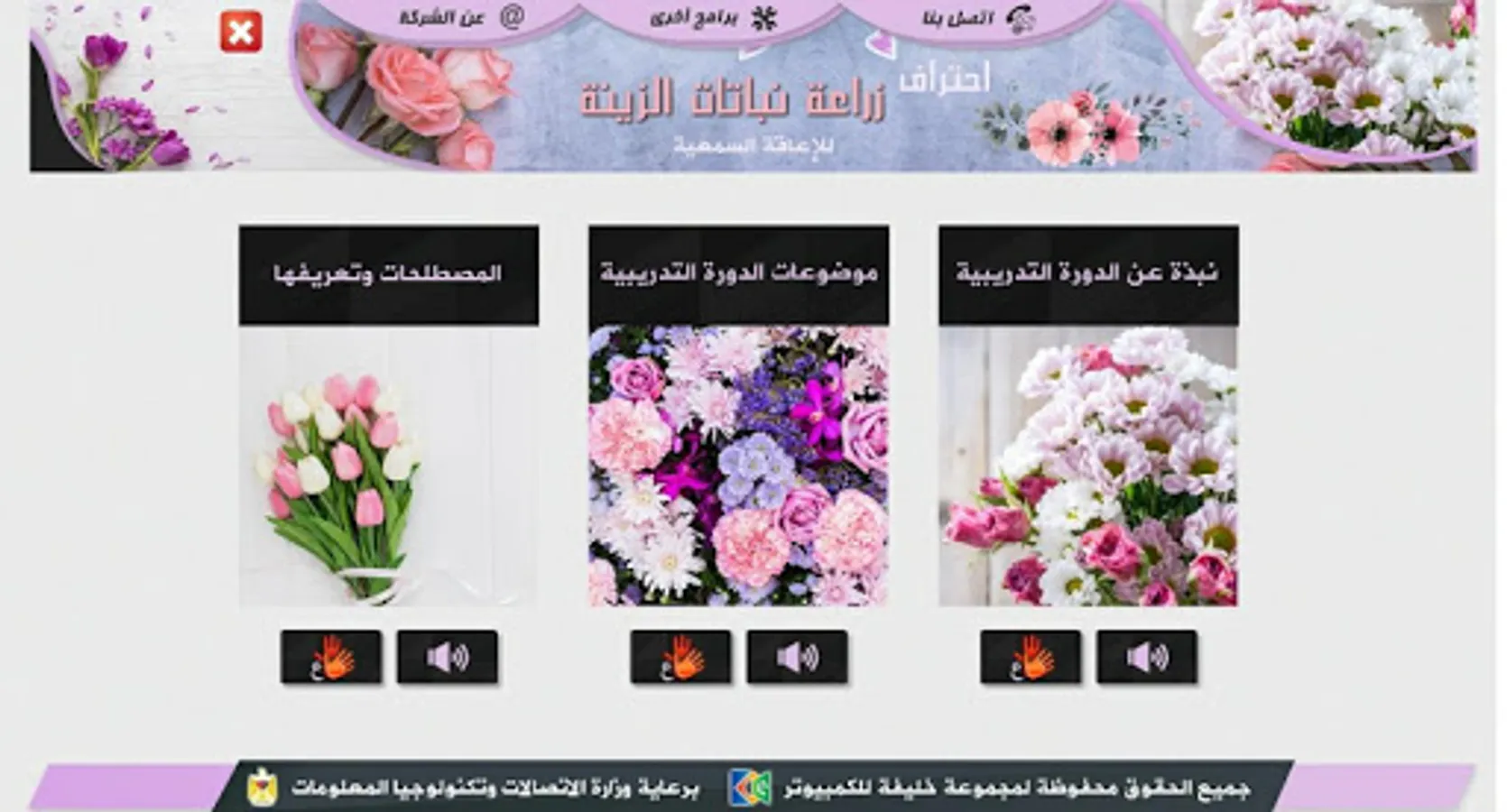 In the context of activating the role of the hearing-impaired and in the context of qualifying them / they for the labor market through the specialized and professional training courses required in society, taking into account their disabilities and their culture, we present a project idea that is a professional electronic course (self-education) specializing in "ornamental plant cultivation" where it was done Developed as an Android application and a CD that works on Windows and contains more than 15 main and sub topics covering the scientific material necessary to qualify the user to implement final products on his own using the videos that explain the way of working and translating the sign language with video, audio, text and illustrations where will be illustrated M application and method of browsing and preparing the content in an easy way taking into account the audio disability, the following are the most important topics that will be covered by the electronic training course: