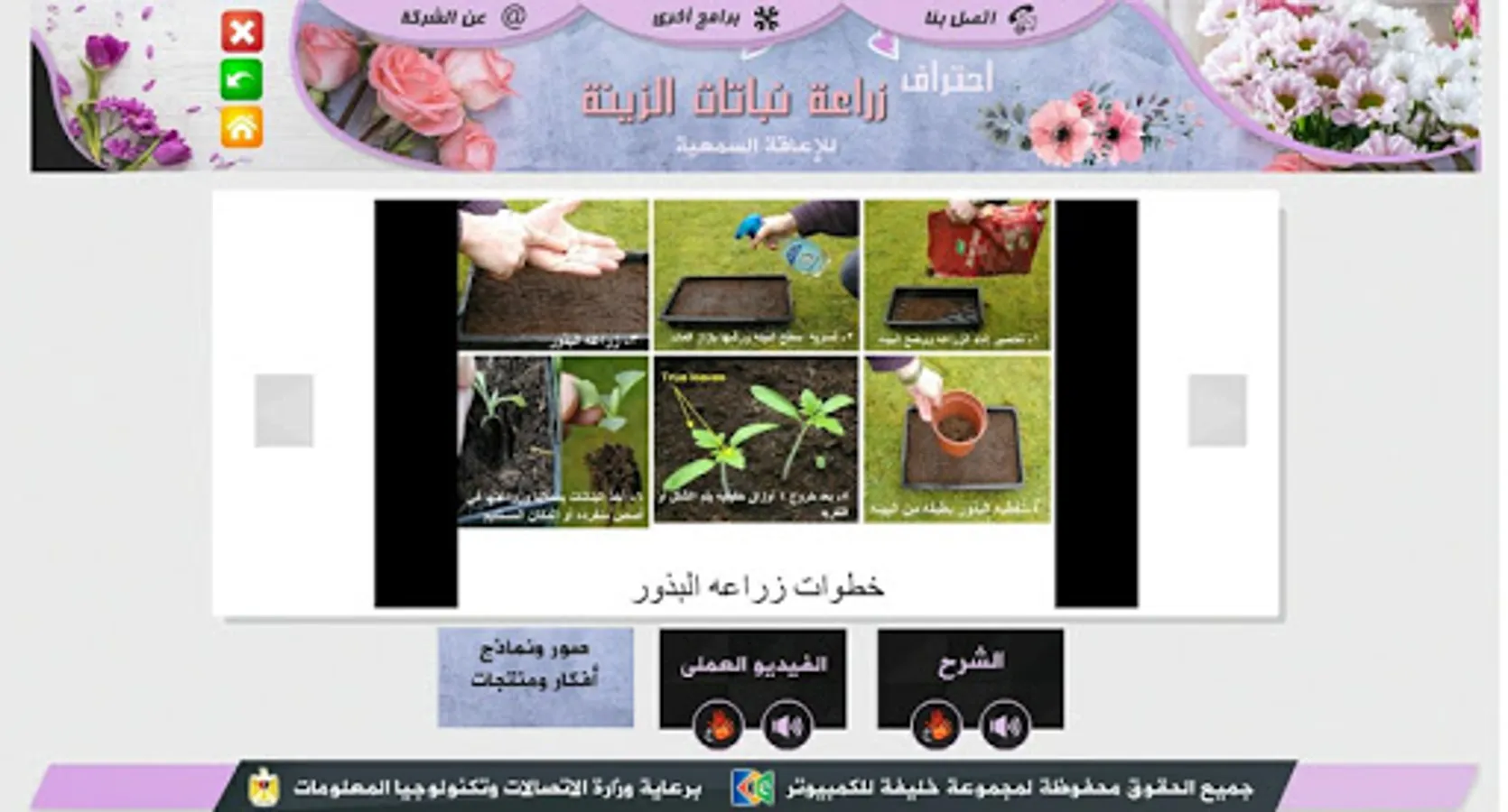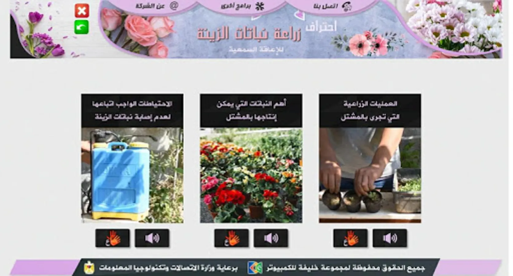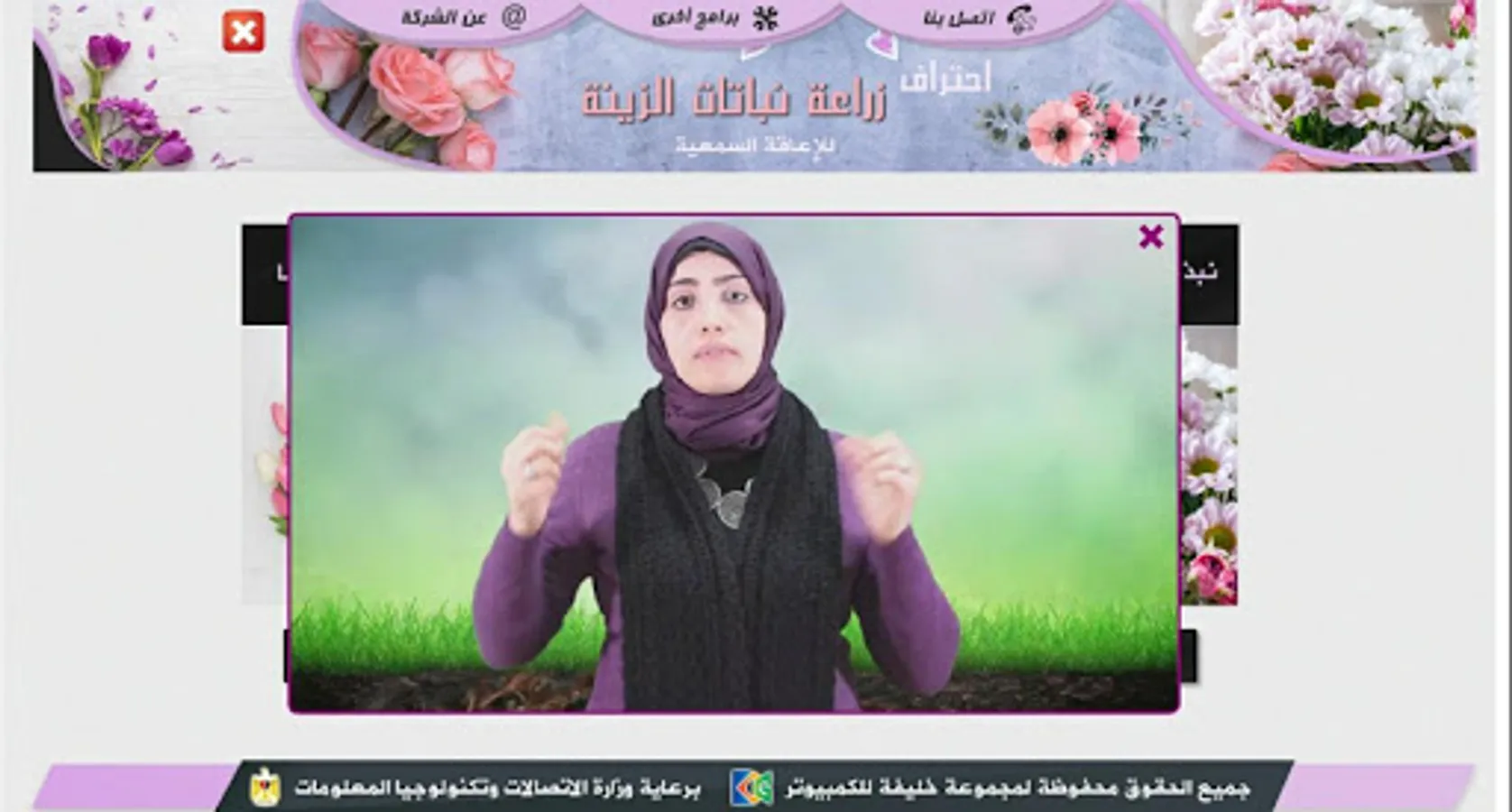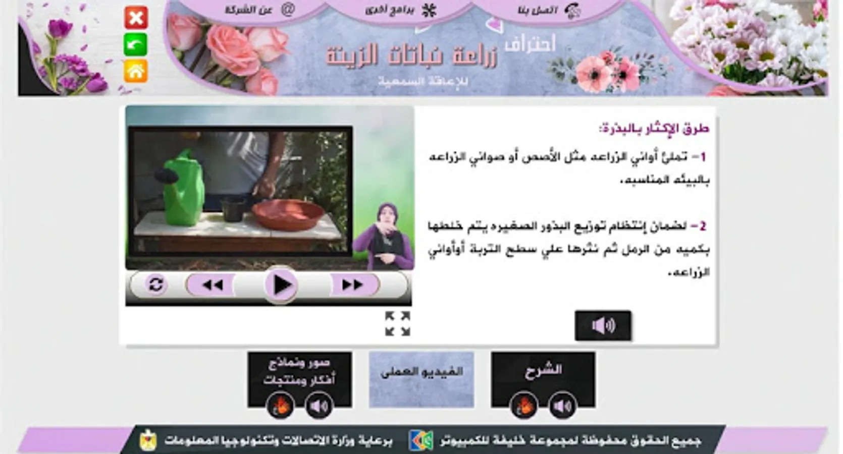 In the context of activating the role of the hearing-impaired and in the context of qualifying them / they for the labor market through the specialized and professional training courses required in society, taking into account their disabilities and their culture, we present a project idea that is a professional electronic course (self-education) specializing in "ornamental plant cultivation" where it was done Developed as an Android application and a CD that works on Windows and contains more than 15 main and sub topics covering the scientific material necessary to qualify the user to implement final products on his own using the videos that explain the way of working and translating the sign language with video, audio, text and illustrations where will be illustrated M application and method of browsing and preparing the content in an easy way taking into account the audio disability, the following are the most important topics that will be covered by the electronic training course: