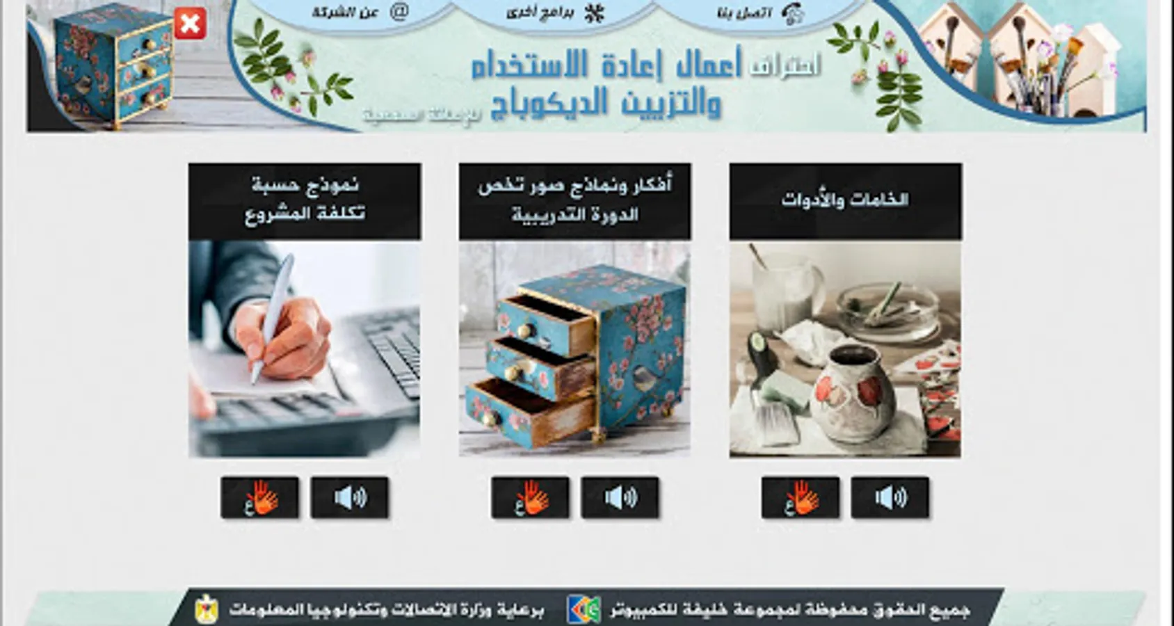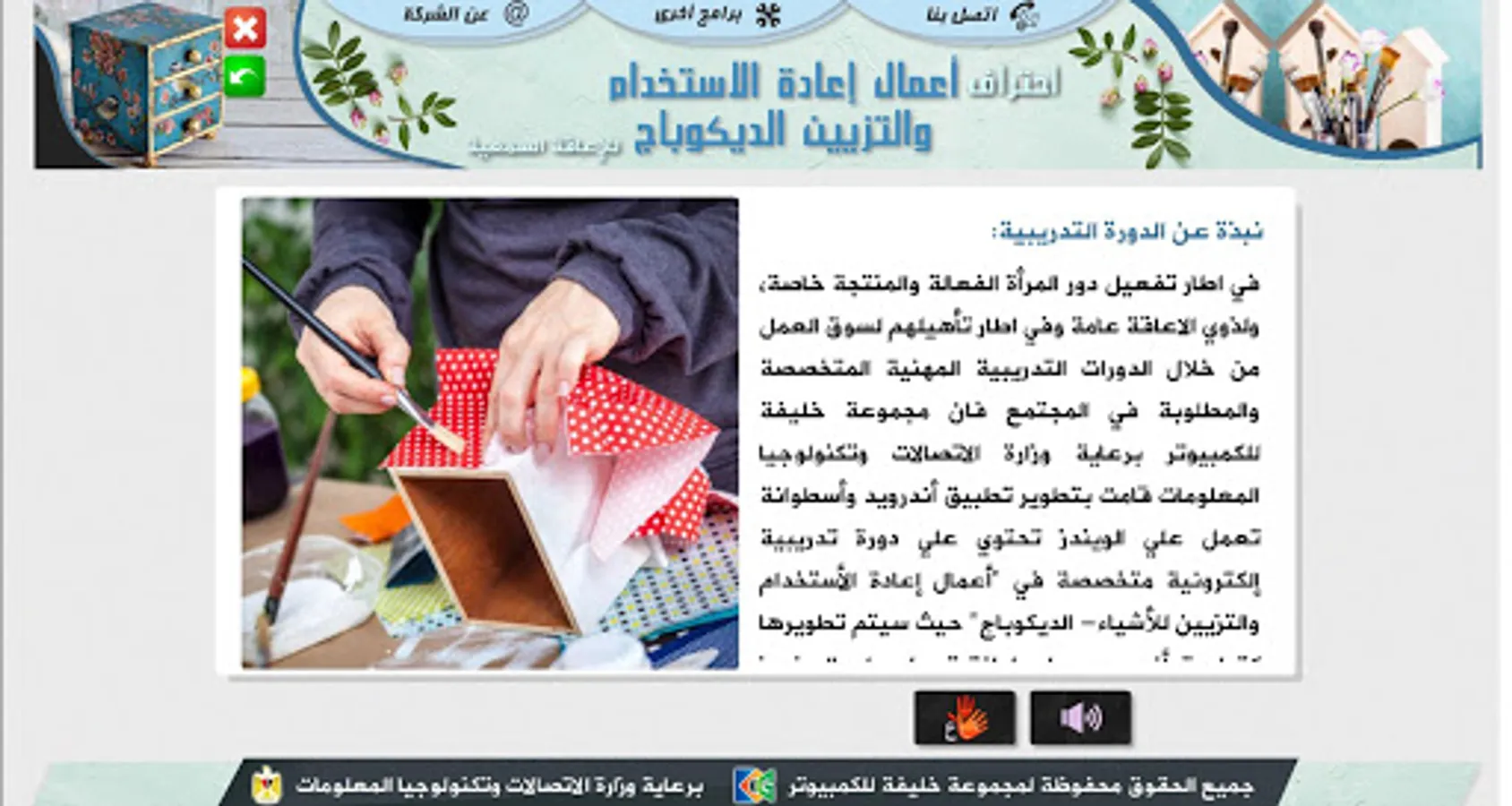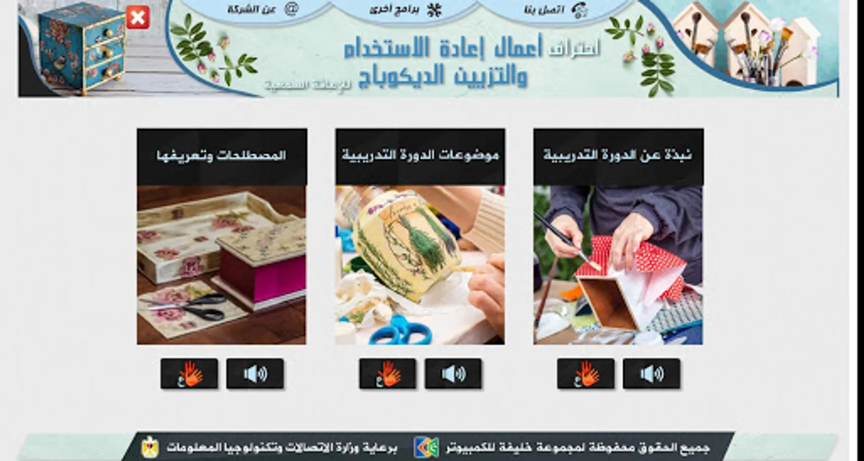 In the context of activating the role of an effective and productive woman in particular and those with hearing disabilities in general and in the context of qualifying her / them for the labor market through specialized professional training courses required in society, taking into account their disabilities and their culture, the project idea is a professional electronic course (self-education) specializing in "re-work The use of things "was developed as an Android application and a CD that works on Windows and contains many topics covering the scientific material necessary to qualify the user to implement final products by himself using the videos that explain the method of work and the translation of sign language with video, audio and text R and illustrations where the application will be browsing and the way the design and preparation of content effortlessly taking into account the hearing impaired, the following are the most important topics covered by the electronic training course: