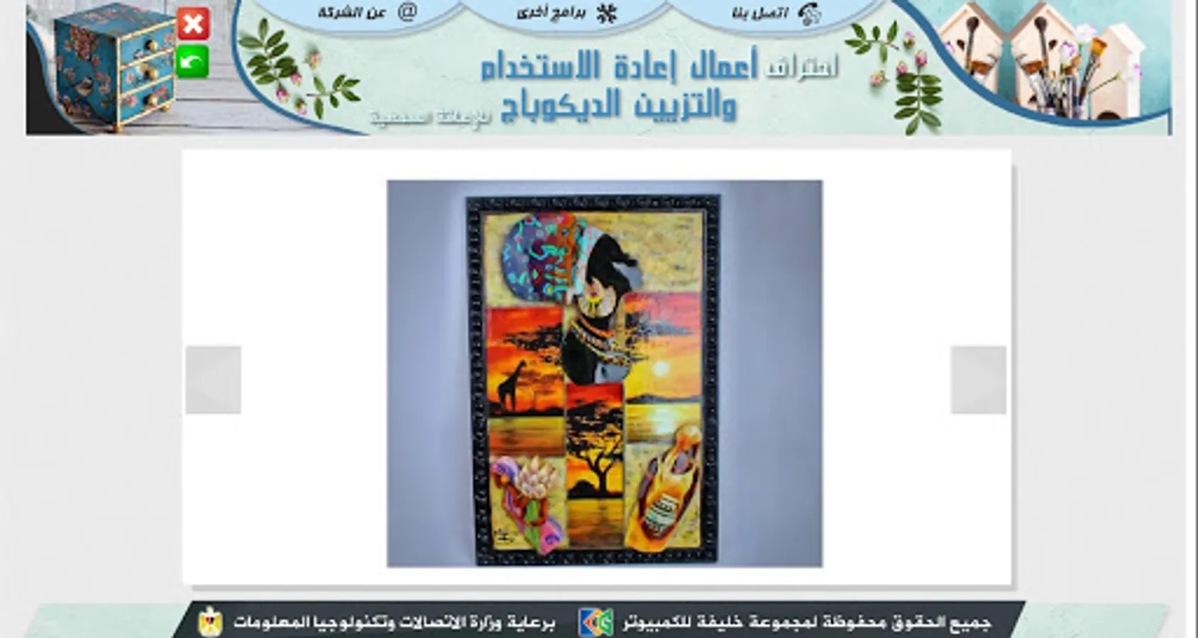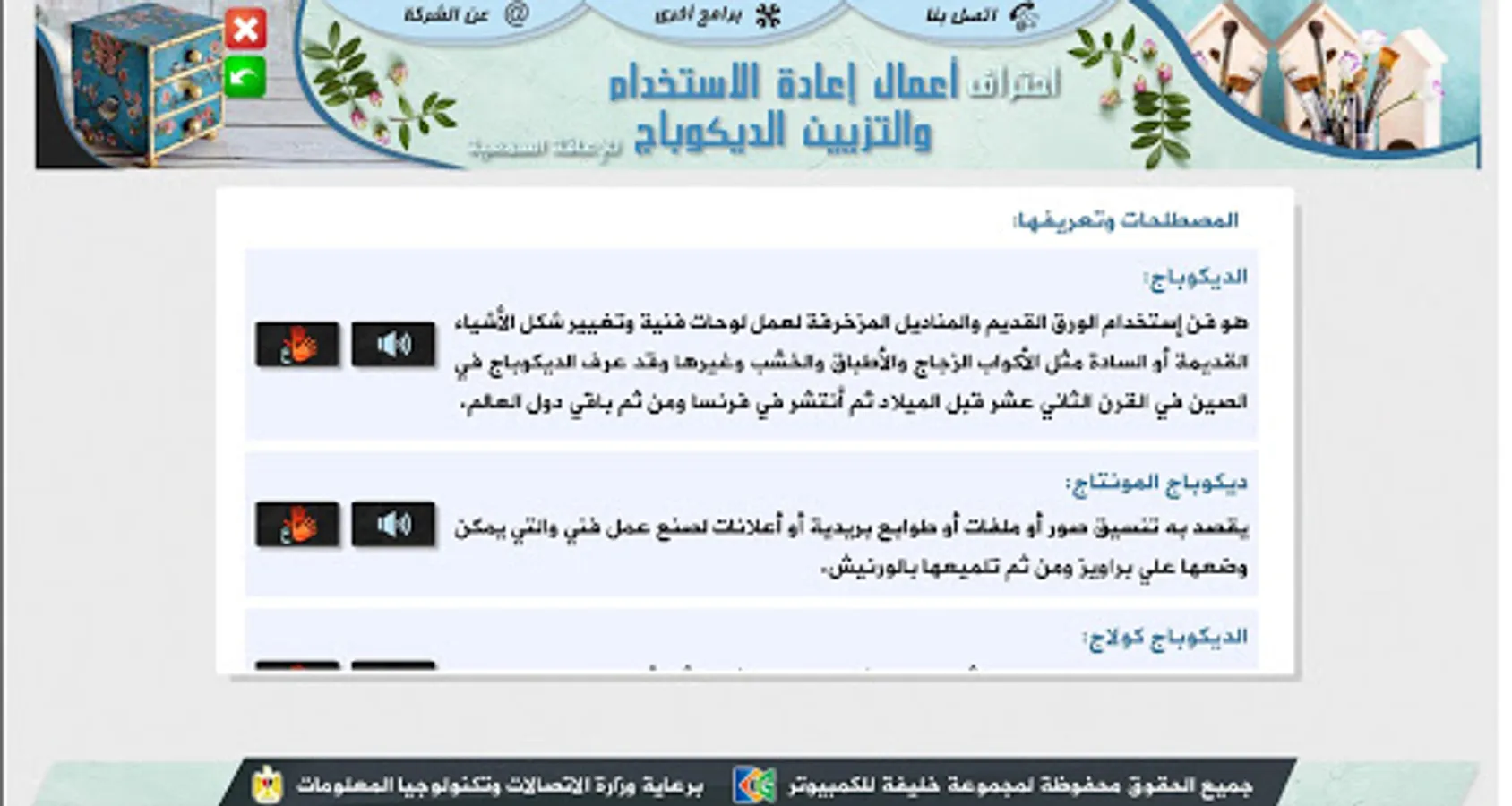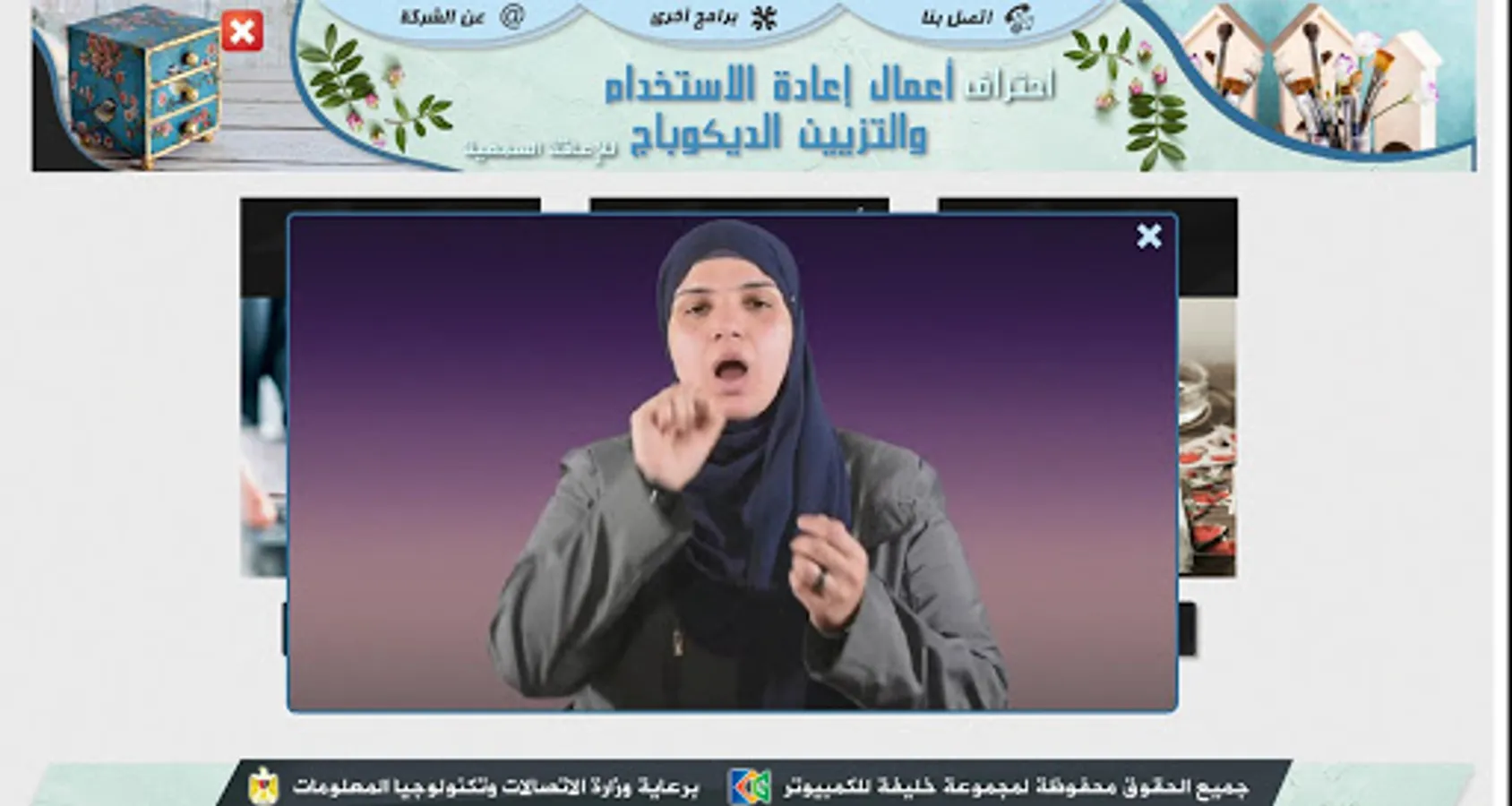 In the context of activating the role of an effective and productive woman in particular and those with hearing disabilities in general and in the context of qualifying her / them for the labor market through specialized professional training courses required in society, taking into account their disabilities and their culture, the project idea is a professional electronic course (self-education) specializing in "re-work The use of things "was developed as an Android application and a CD that works on Windows and contains many topics covering the scientific material necessary to qualify the user to implement final products by himself using the videos that explain the method of work and the translation of sign language with video, audio and text R and illustrations where the application will be browsing and the way the design and preparation of content effortlessly taking into account the hearing impaired, the following are the most important topics covered by the electronic training course: