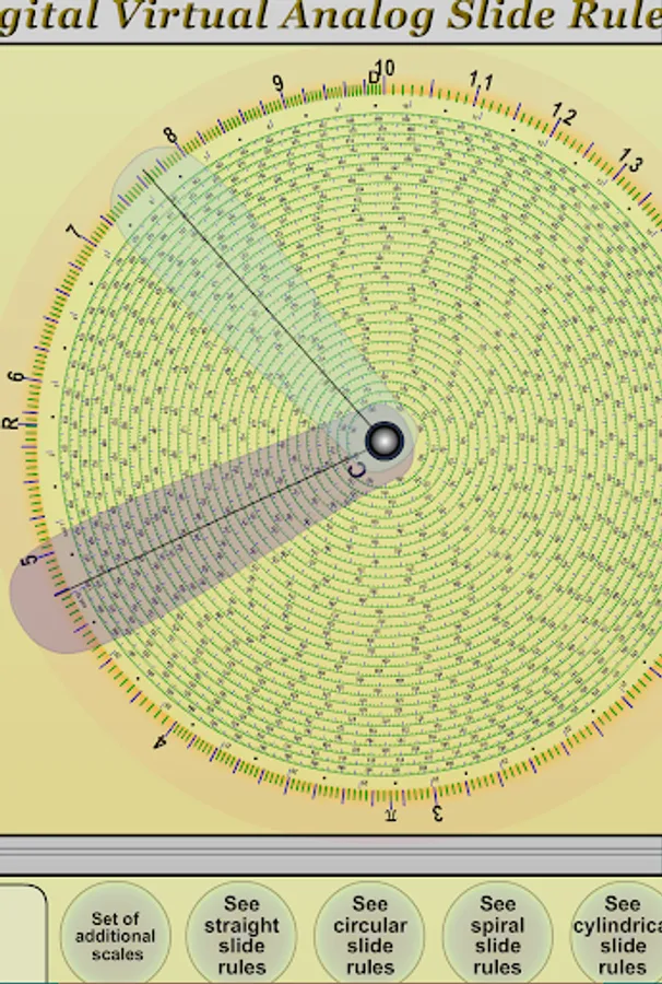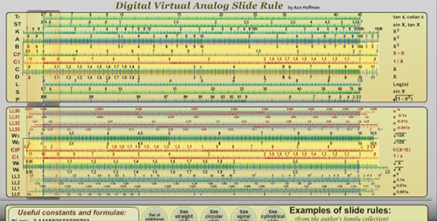 The slide rule was used for over 400 years as a calculating/estimation tool. Abandoned with the advent of hand-held calculators, computers and smart phones, their elegant simplicity is still a thing of wonderment. This program replicates the most common types of slide rules: Straight, circular, spiral and cylindrical. Dozens of scales are included and numerous features that could never exist on a physical slide rule are also included, such as color options, numeric displays of the values under the hairlines, and so on.