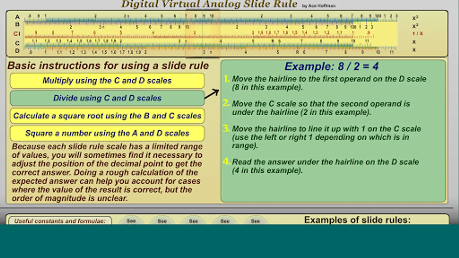 Notes on usage: Program features include "two-finger pinch/zoom." Slide rule slide show images can also be rotated. Enlarge an image by double-tapping in the same place. Tapping three times in the same place will return the program to the home position. Tapping four times will bring up an intro-screen message which requires tapping anywhere to remove.