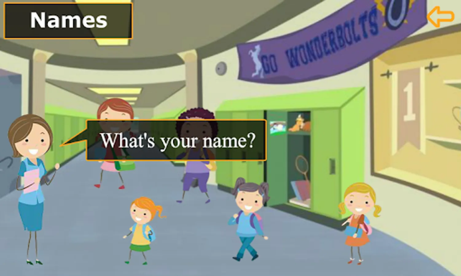 👉 Interactive lessons teach kids to ask about name and answer with following eng grammar.