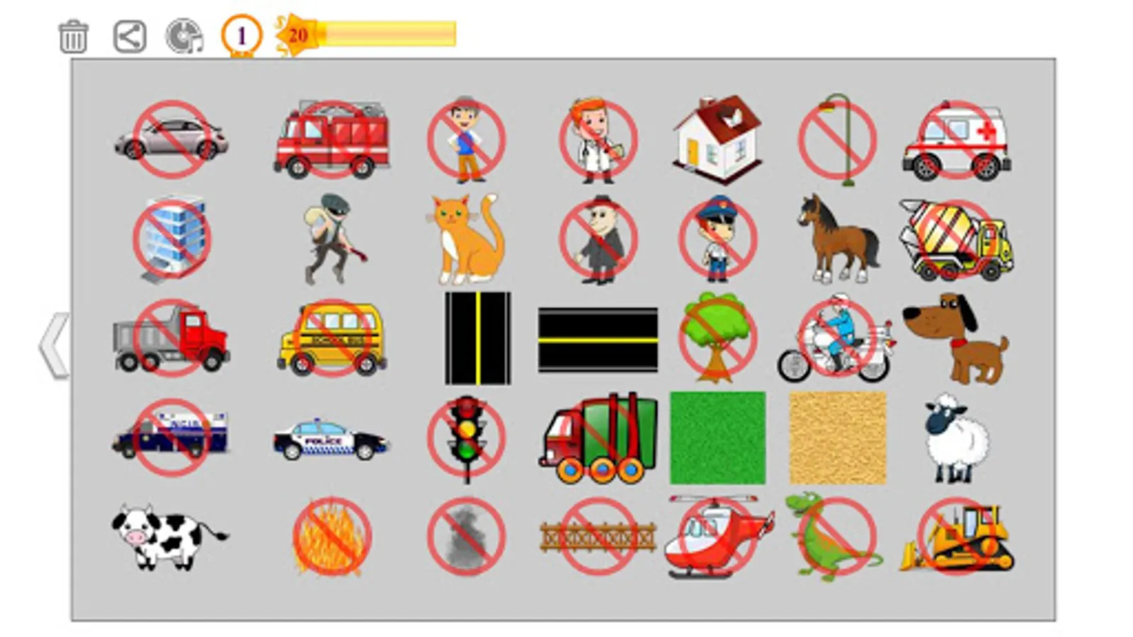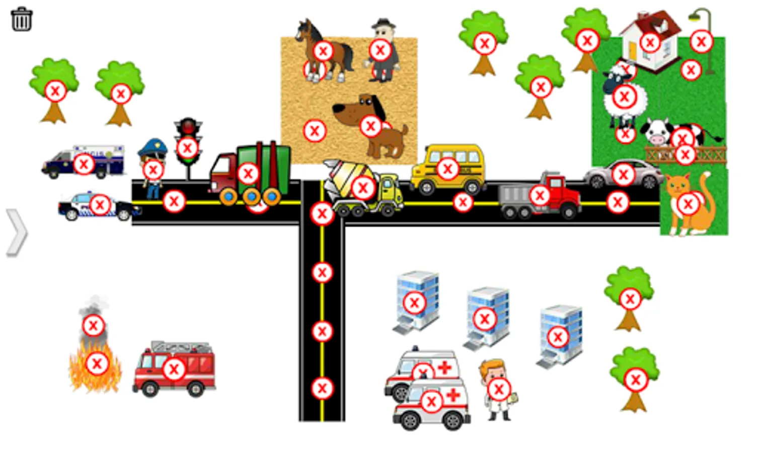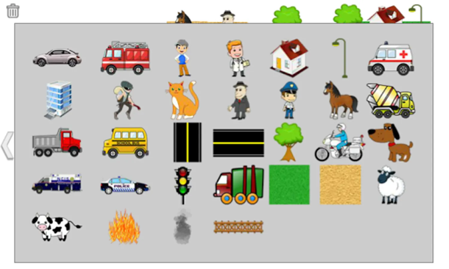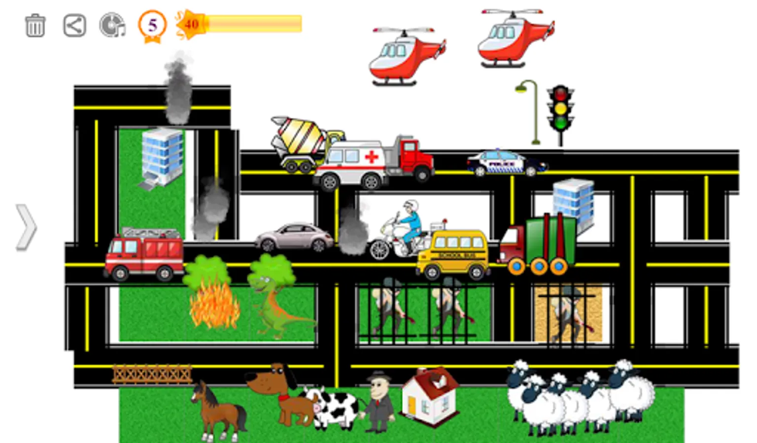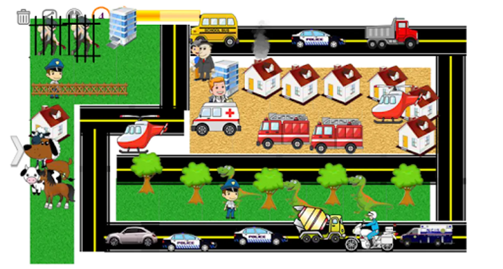 Vehicle, fire truck, boy, doctor, house, lighting column, ambulance, residential building (tower), robber, cat, businessman, policeman, horse, concrete truck , standing street, steading street, tree, policeman motorcycle, dog, police truck, police car, traffic light, garbage truck, grass, sand ground, sheep, cow, fire, smoke, Fence, helicopter, dinosaur, bulldozer.