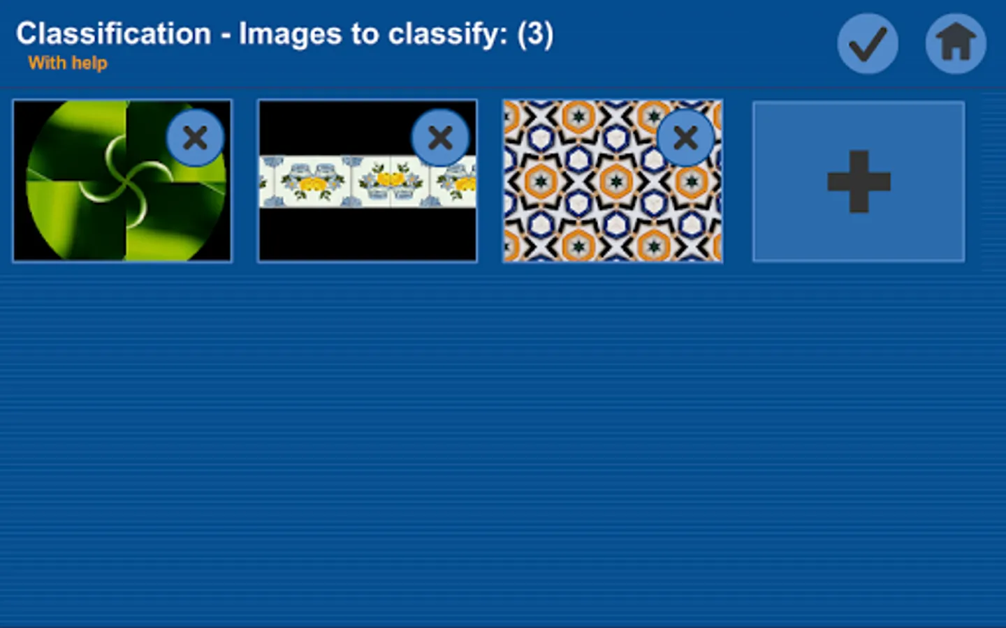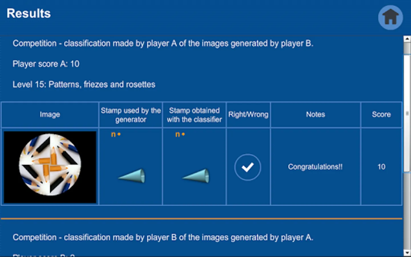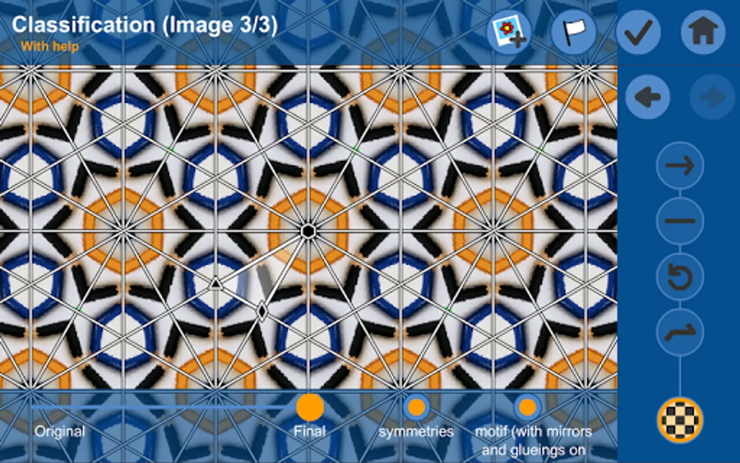 The generator writes encoded information about the existing symmetries in the jpg image file generated. Then the classifier reads and interprets this coded information, which allows it (according to the level of aid chosen) to give information about how the classification process is going, preventing wrong choices, or only indicating at the end whether the classification is correct and, if not, indicating the first mistake.