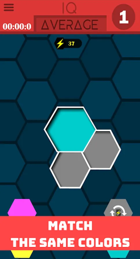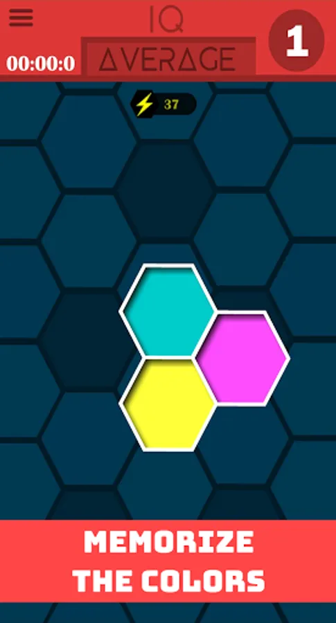 Genius Color Match tests your IQ by keeping track of the correct matches your memorized, the time it took you to match the colors and if you used any bolts to help you get to the next level. With this data a unique algorithm is conducted and adds up your IQ on the screen. So make sure to memorize the correct colors and Don't take to long when placing them in the correct hexagons! You will be given the appropriate IQ level of AVERAGE, SMART, GENIUS and EINSTEIN!