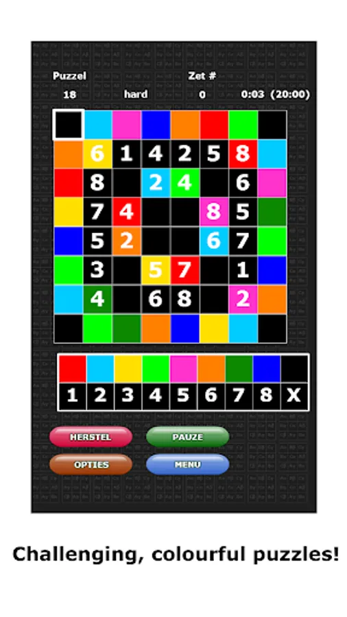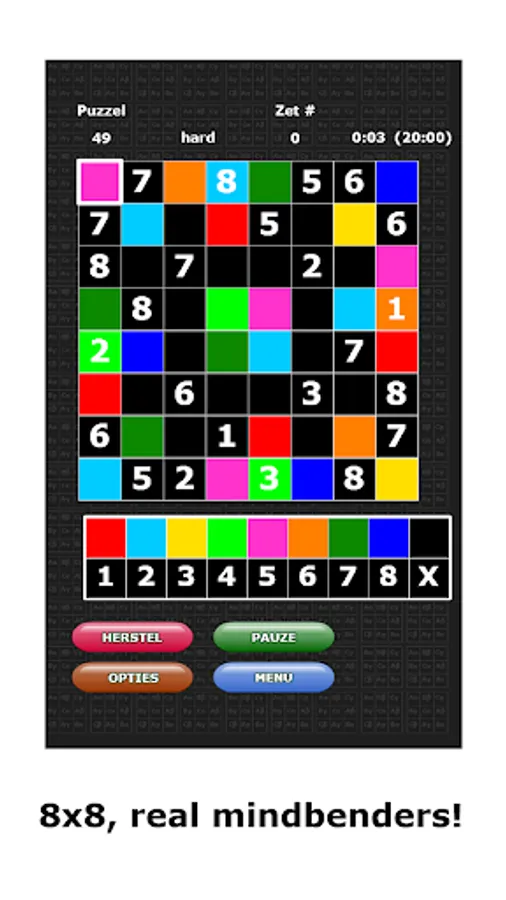 At Disoku Pro you have real brainteasers for experts, with puzzles of size 5, 7 and 8. Most of the puzzles show a nice symmetric pattern. There are 120 puzzles with different sizes and difficulty. Some of them are just solvable within 25 minutes. If you are not an expert, you will be after solving these real mindbusters.