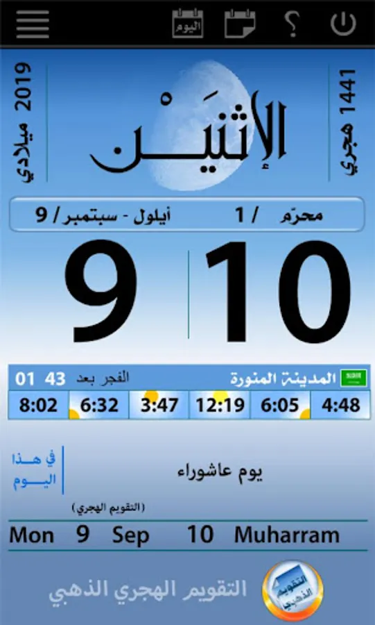 - Display the date of the Hijri and Gregorian and current day clearly, and a picture of the different phases of the moon linked to the month of the month (taking into account that the picture may not reflect the reality completely)
