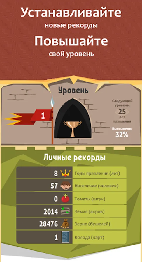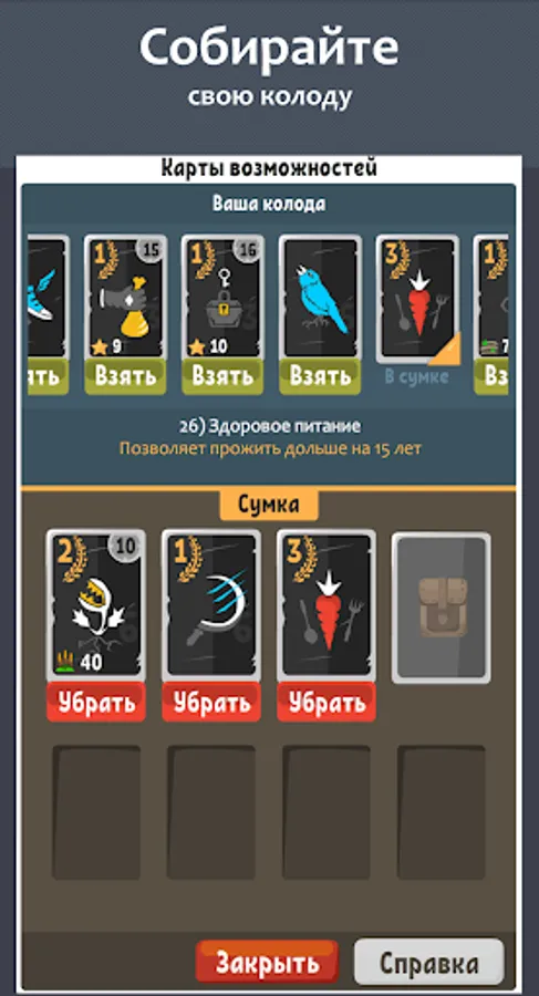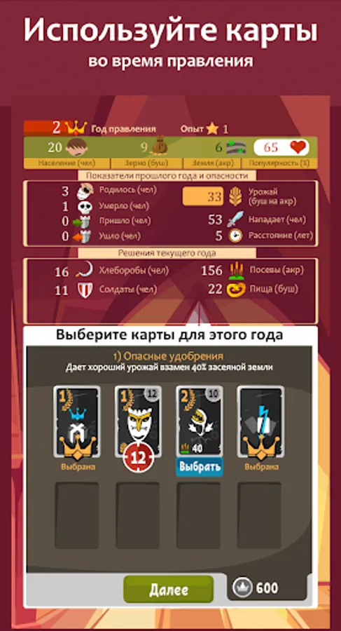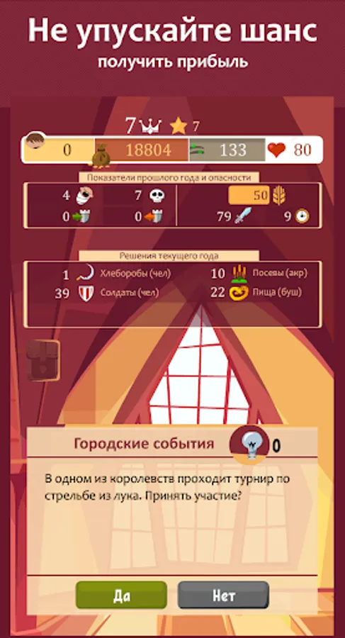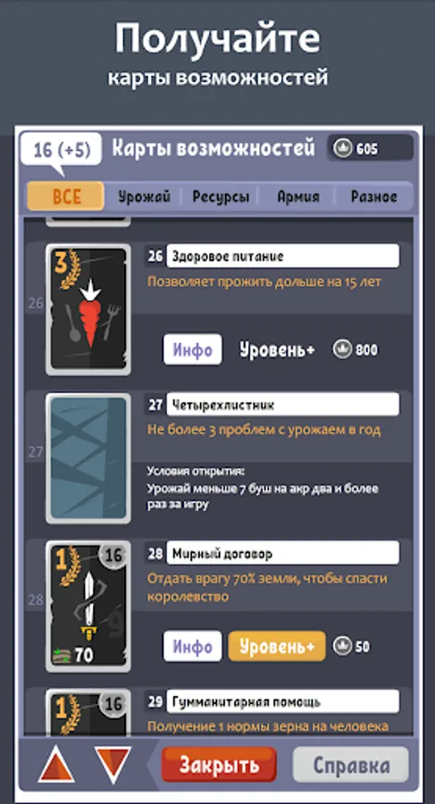 Using cards expands your options. You can get cards by completing tasks or making the right decision in city events. Do not forget to increase the level of cards. The Tool Sharpening card increases the productivity of grain growers, and the Good Shaman card will save your harvest from bad weather. You will learn about other cards in the game.