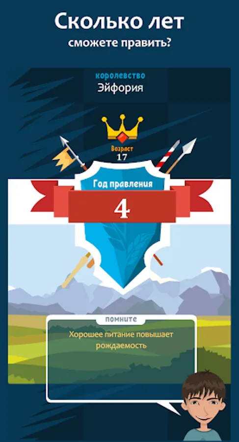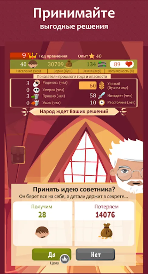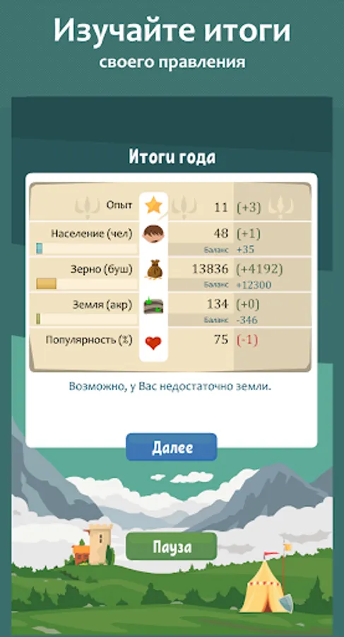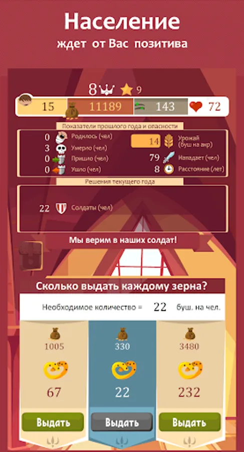 The mechanics of the game are pretty simple. There are 4 types of resources at your disposal: population (people), grain (bush.), Land (acre) and popularity (%). At the beginning of the year you need to make several important decisions, and at the end of the year to study a report on the current state of affairs in the kingdom.