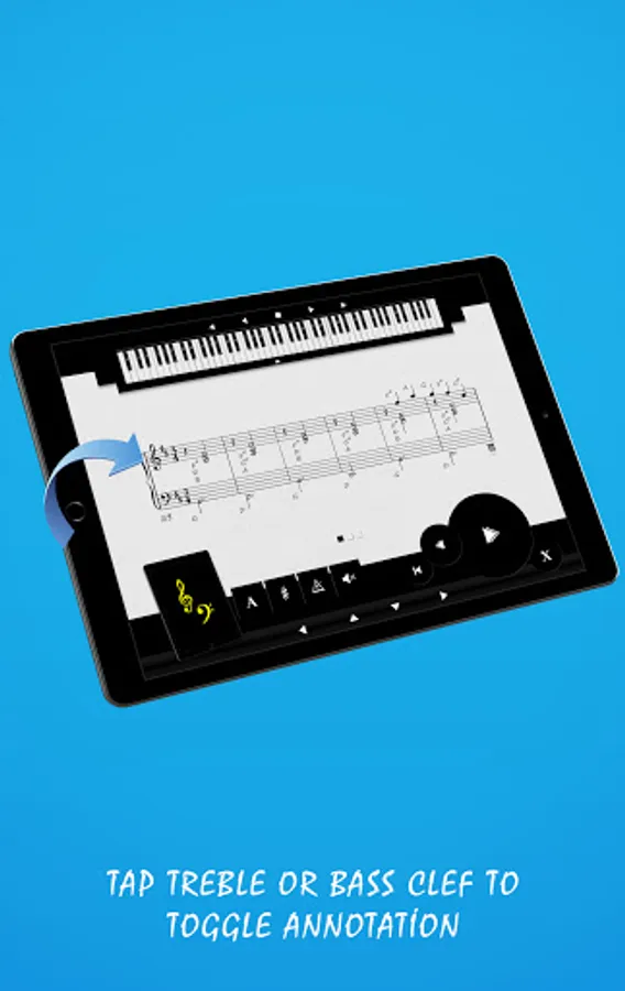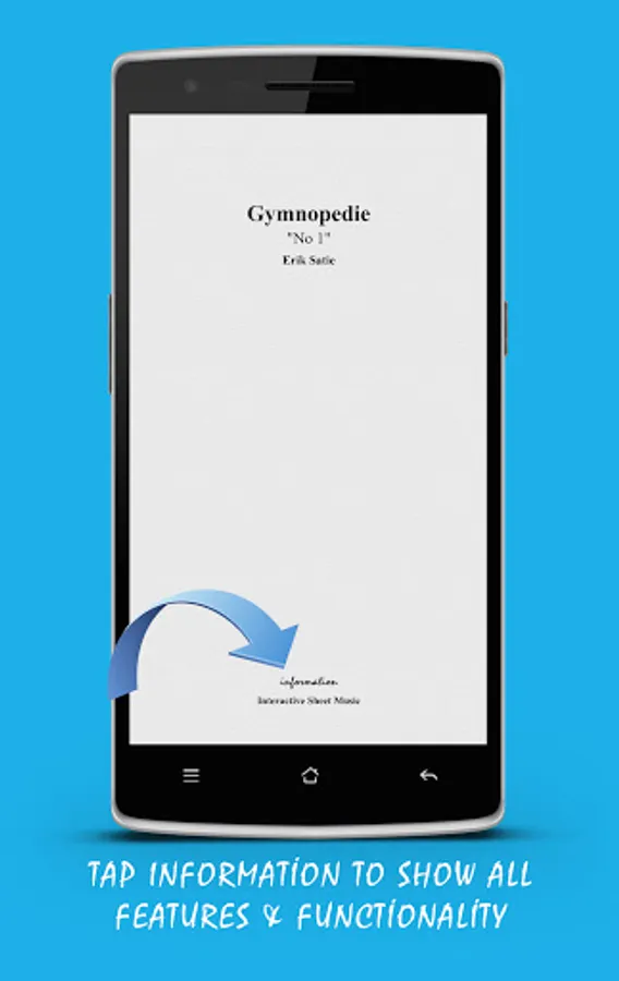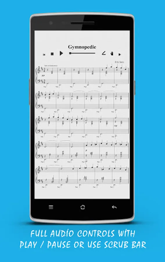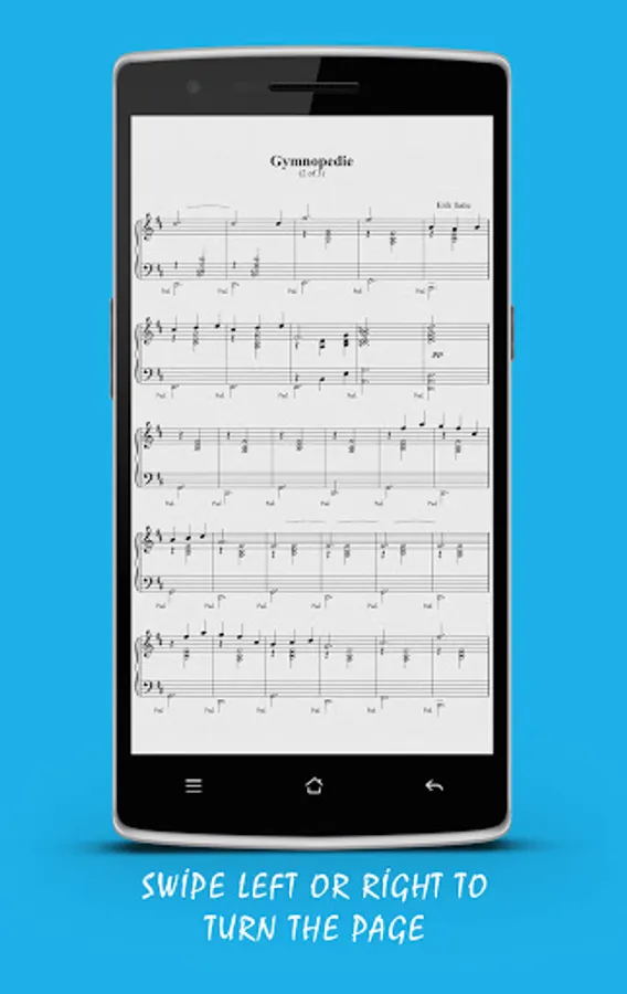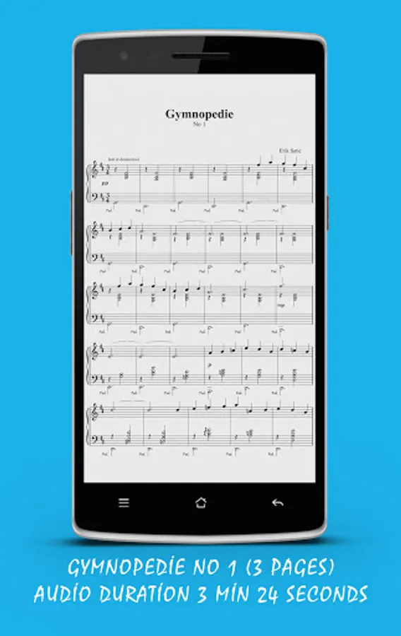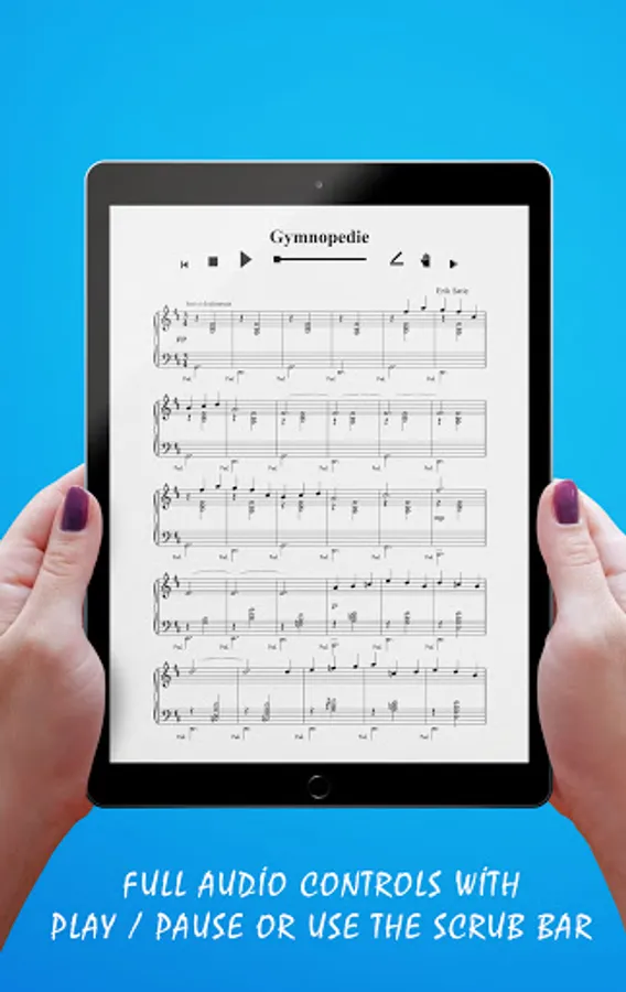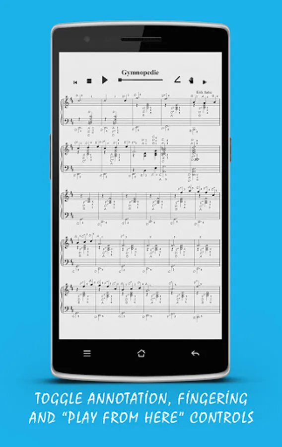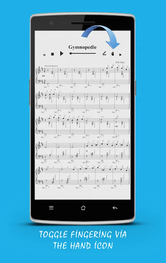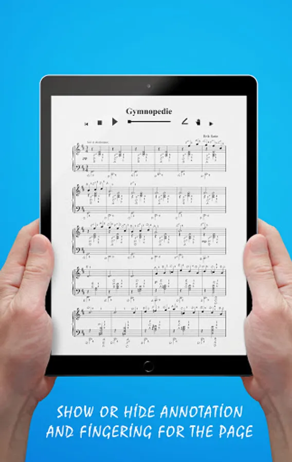 Our Piano Sheet Music App contains interactive features hidden from view upon launch yet quickly accessible when you need them. Tap on the composer name (Erik Satie) to show or hide annotation and fingering or play audio from specific parts of the songbook.