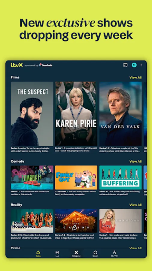 ITVX is the new home of ITV Hub. But bigger, better and fresher than ever. It’s full of films that refresh regularly, thousands of iconic British and American box sets, and exclusive series. Hilarious sitcoms, irreverent game shows, classic dramas, cult classics and event extras. Live. On demand. Catch up. And feel like you’re right there in the stands with world-class sport straight to your screen as it happens. It’s all fresh, and it’s all free. Let’s go.