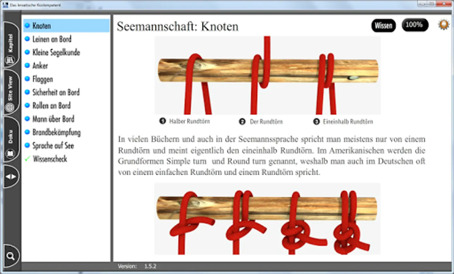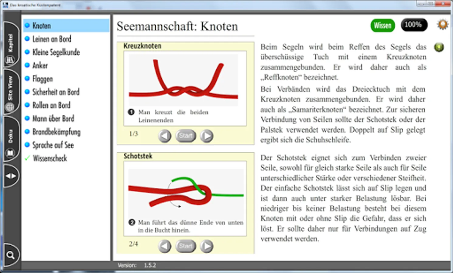 Seamanship: knots, canvas on board, anchors, flags, safety on board, man overboard, fire fighting, Seesprechfunk, Engine customer.