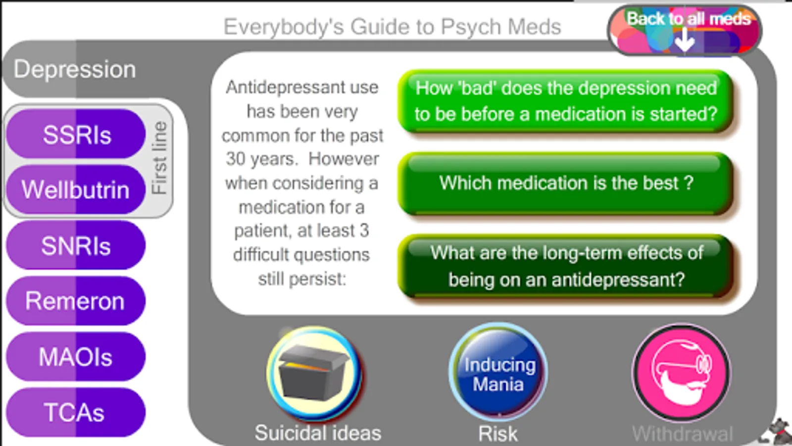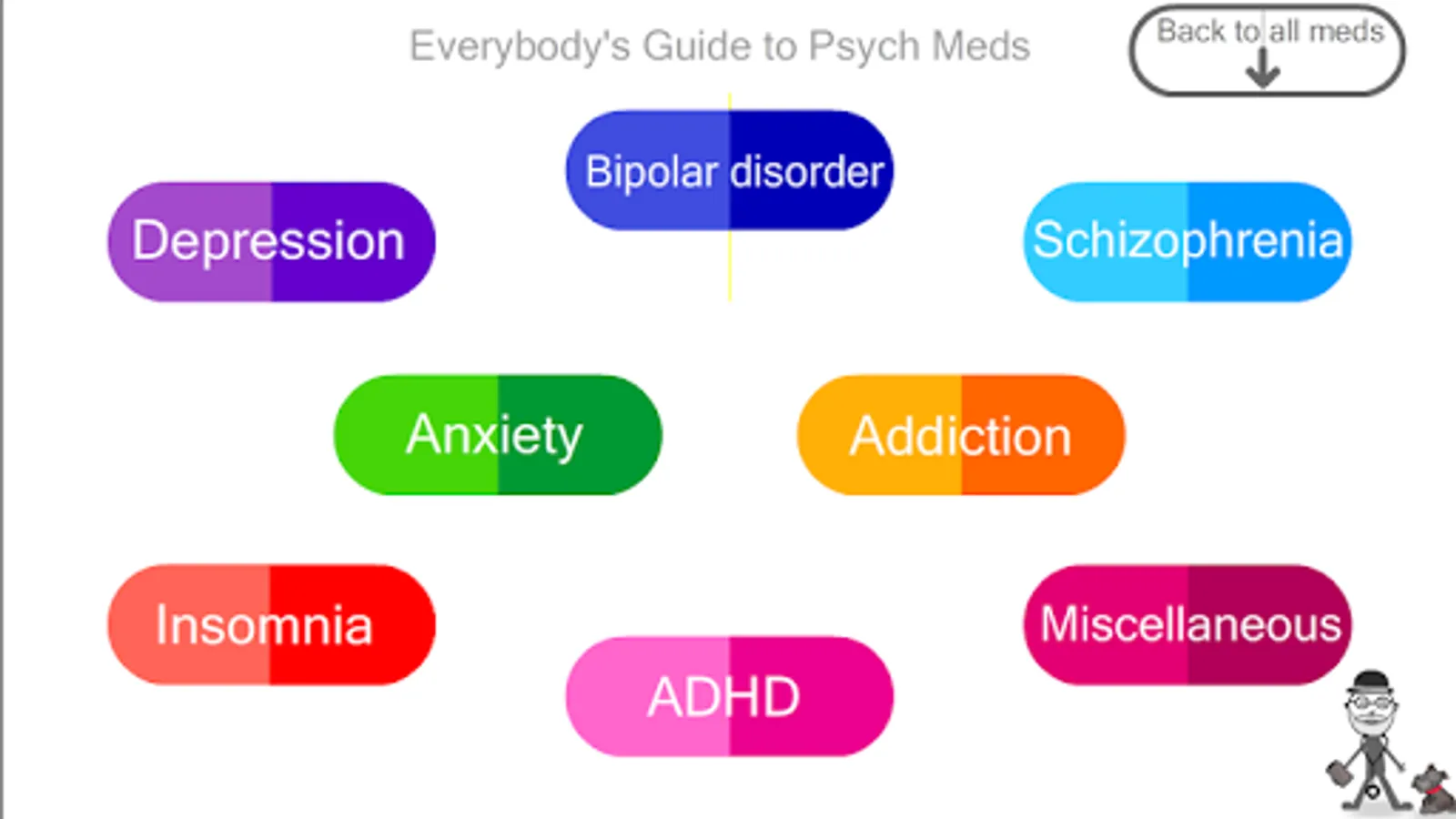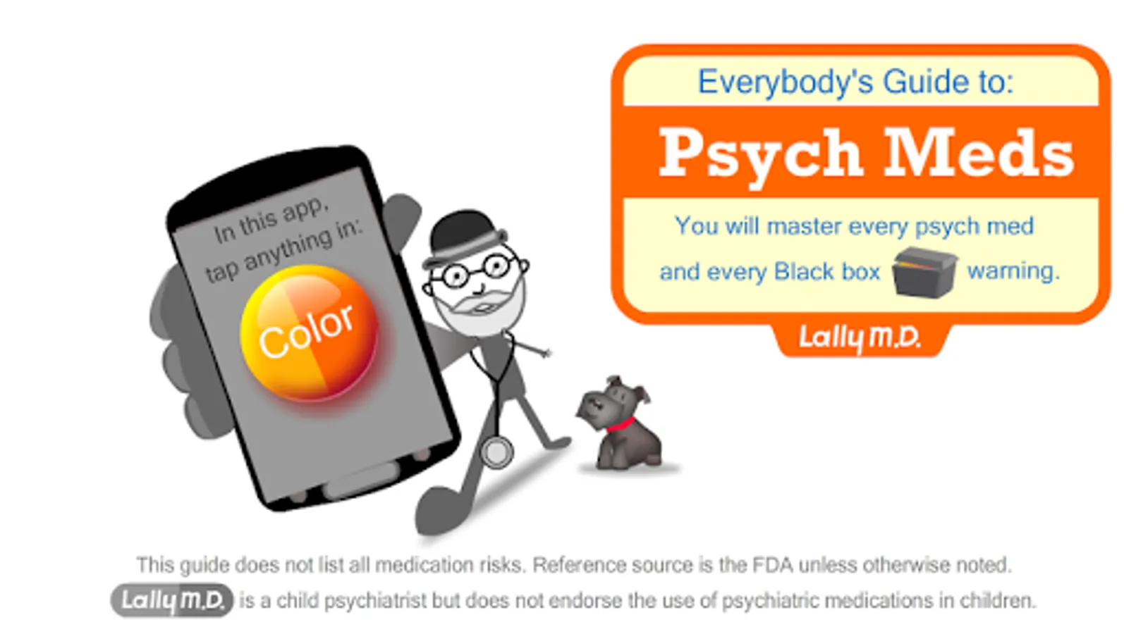 This app is colorful and animated and easy-to-use, just like a video game. But is not a video game. It a guide to all psychiatric medications. It is evidence-based with references from the FDA and the world's best medical and mental health journals.