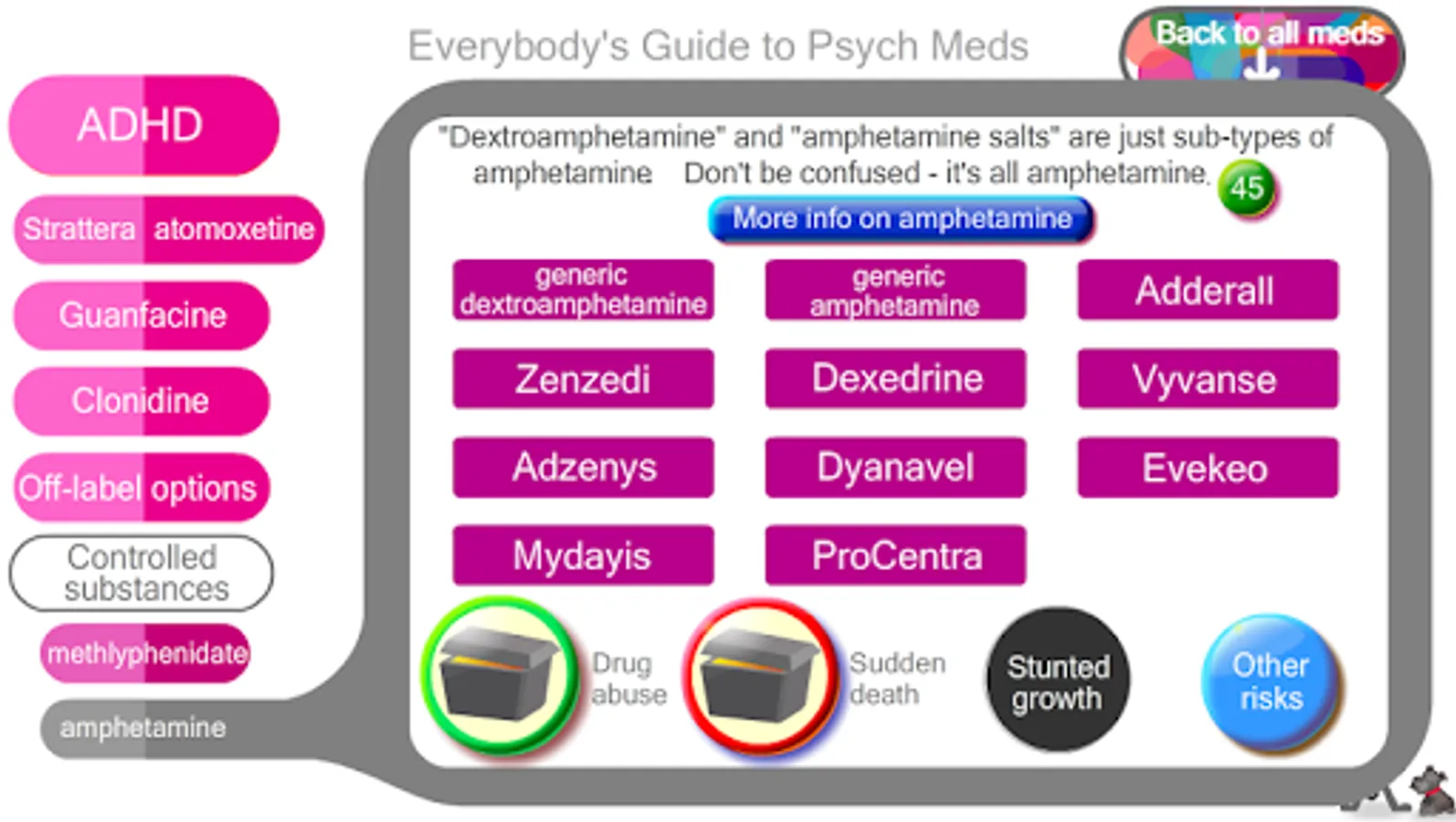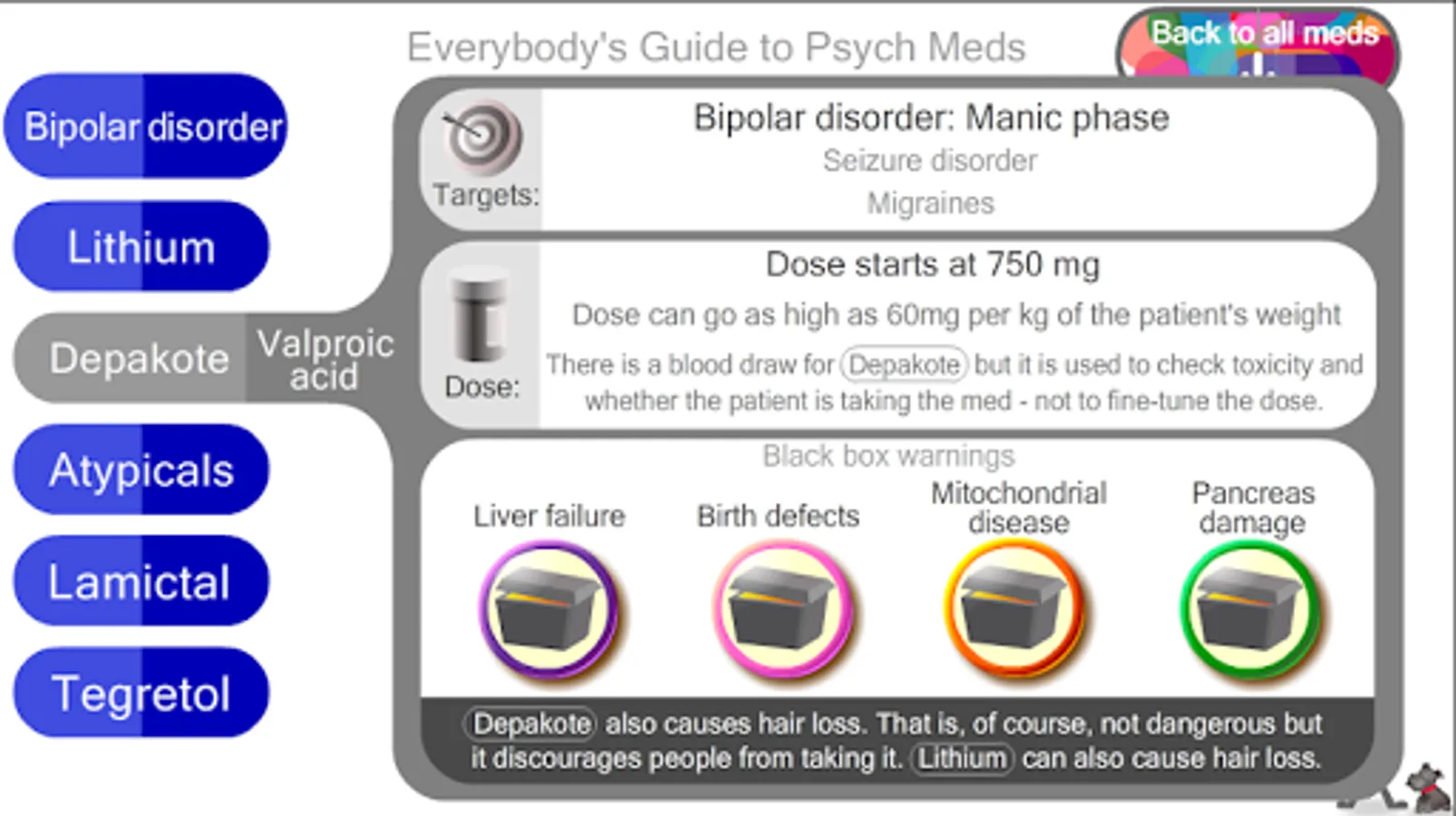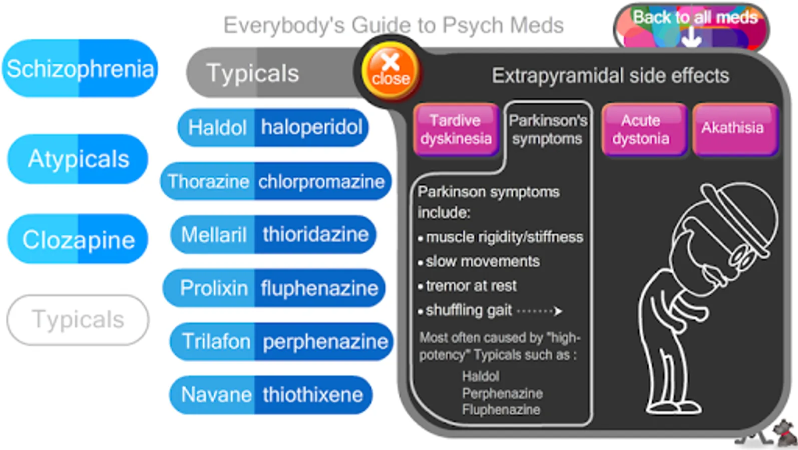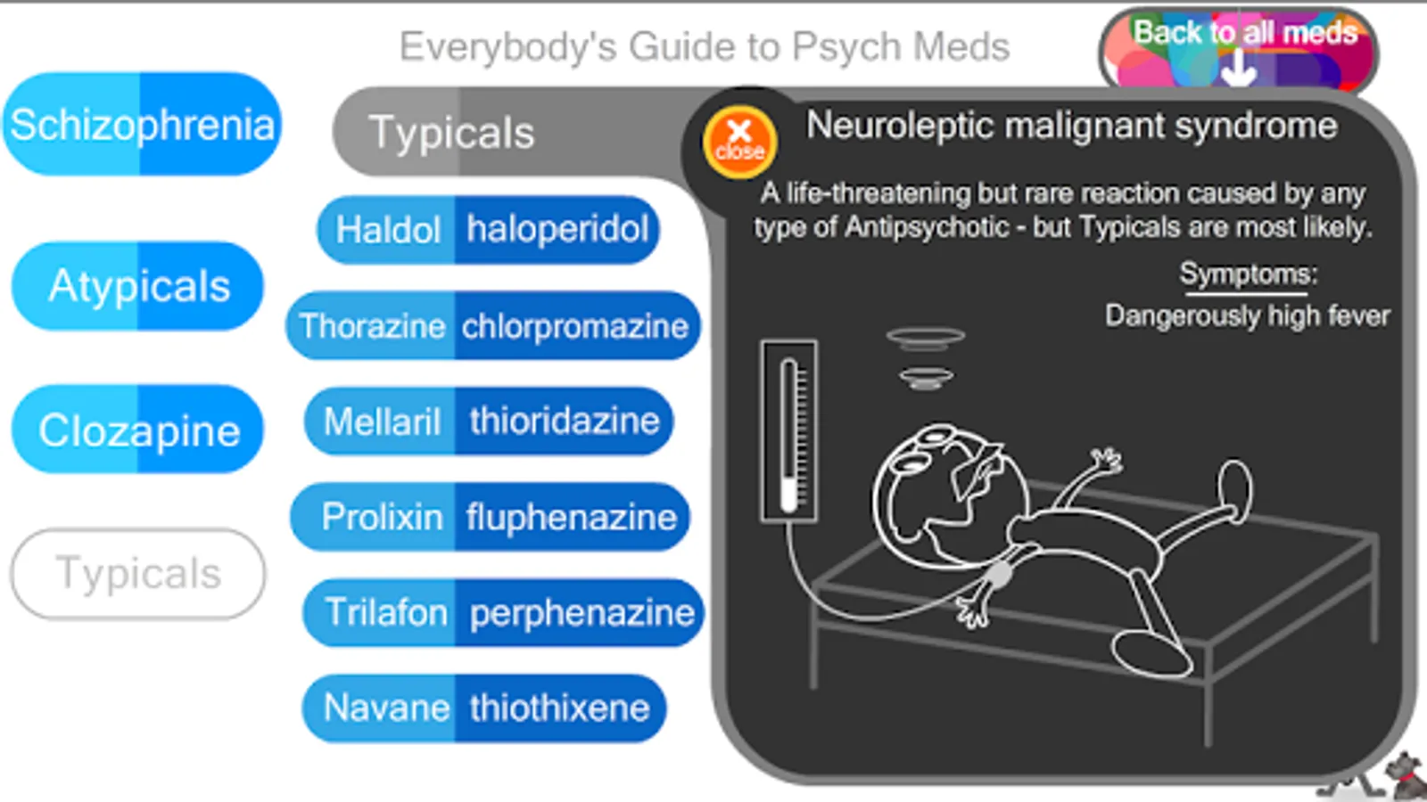 This app is colorful and animated and easy-to-use, just like a video game. But is not a video game. It a guide to all psychiatric medications. It is evidence-based with references from the FDA and the world's best medical and mental health journals.