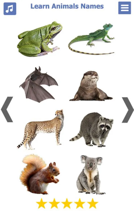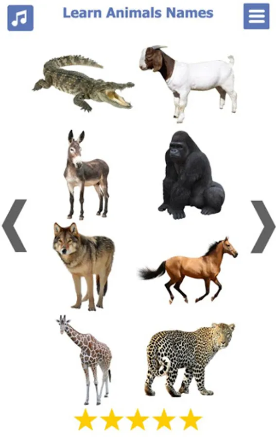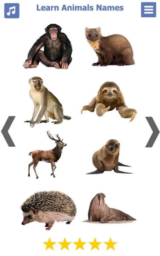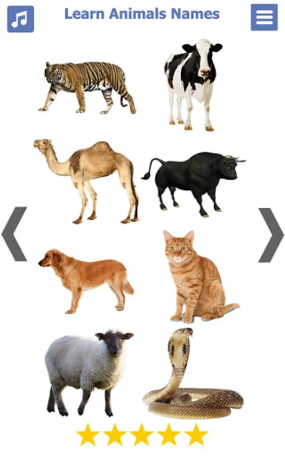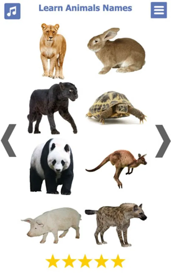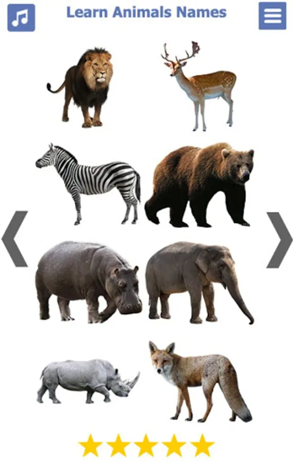 Easy and interesting educational Application teaches the names of different animals in the English Language with animal sounds and animals pictures.