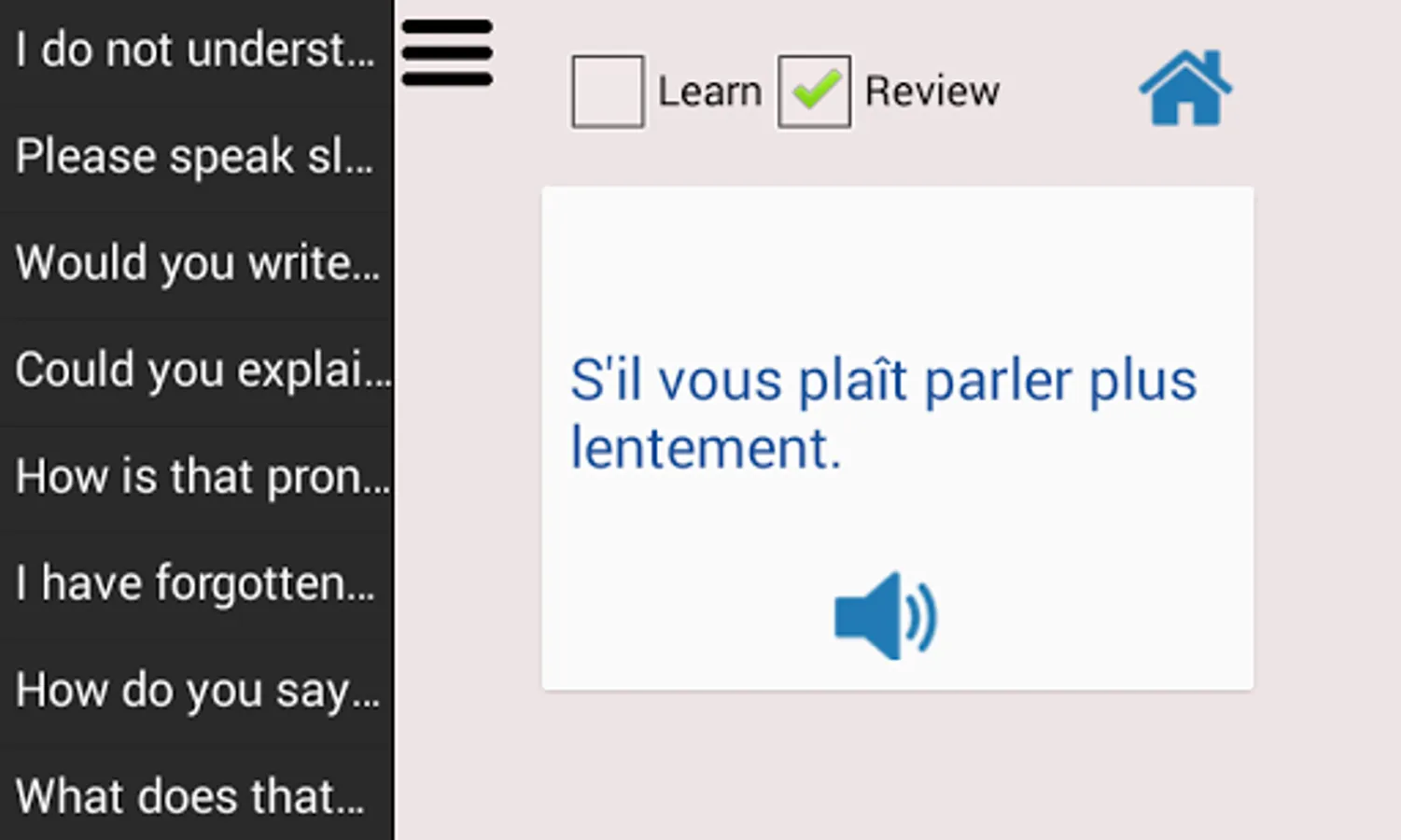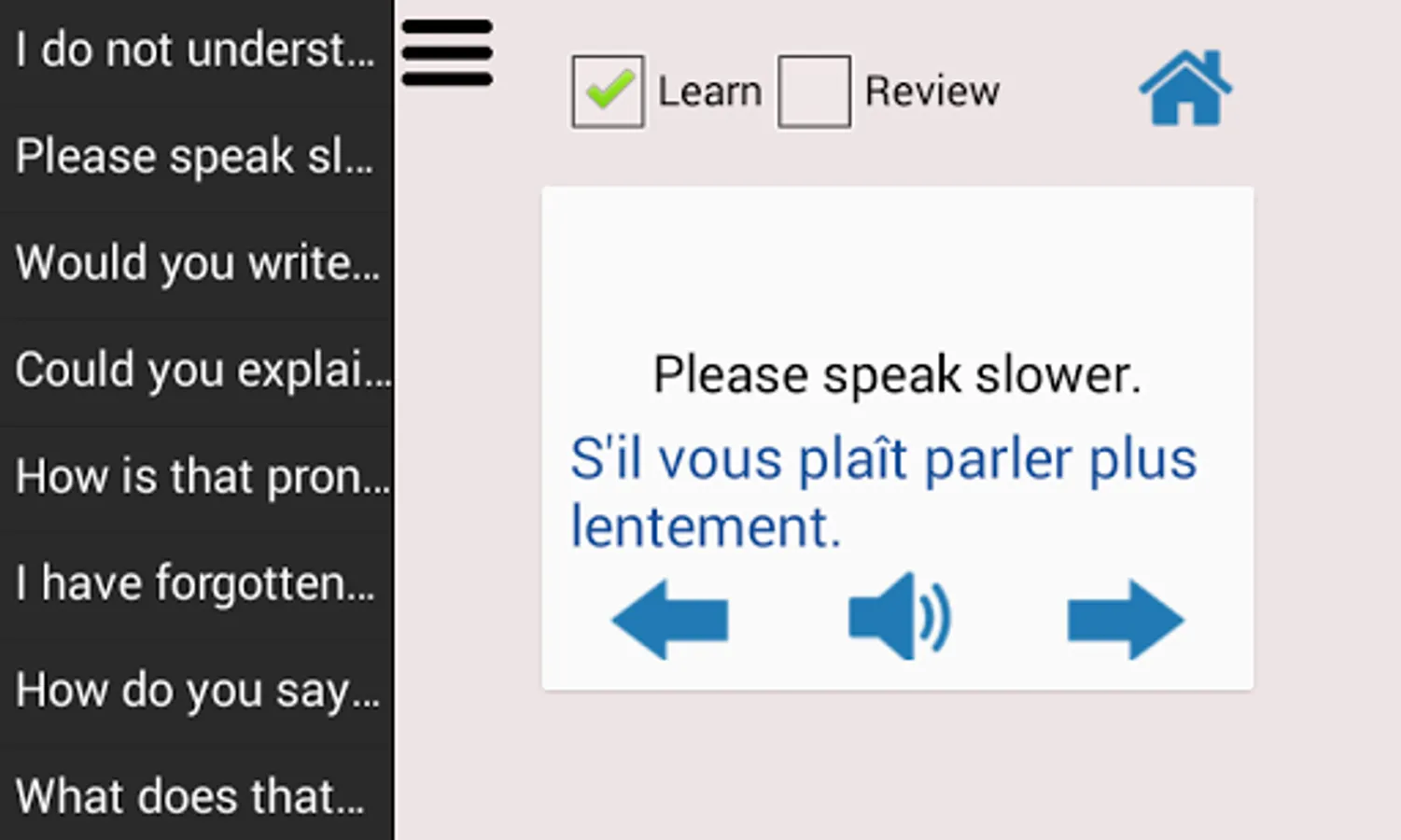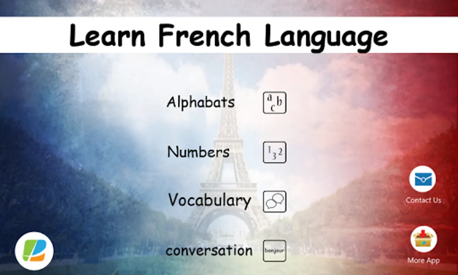 Learn French Language Lets you learn French language with your Device at any place you may want to read the sentences, listen and repeat. Practice anywhere you go, Useful app for tourists and business people who travel to France, Switzerland, Canada, Belgium and many more French speaking countries or elsewhere. Learn basic French conversational skills, Learn French vocabulary with general words, and conversation phrases, Voice recorded by native French speakers you can exercises to test what you have learned. Integrated Alphabet Writing helper and Visual images to practice with.
