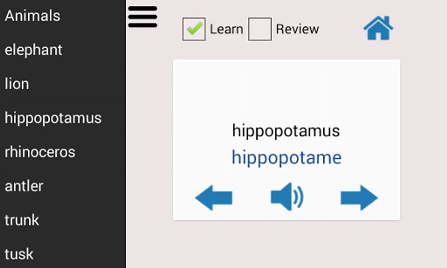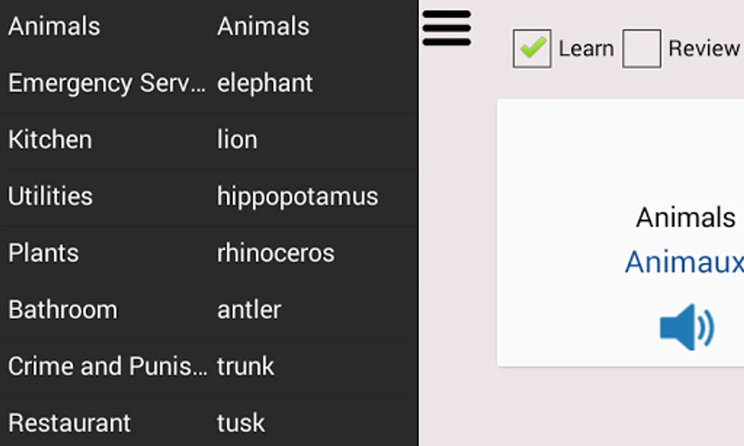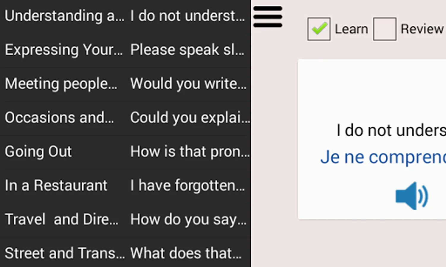 Learn French Language Lets you learn French language with your Device at any place you may want to read the sentences, listen and repeat. Practice anywhere you go, Useful app for tourists and business people who travel to France, Switzerland, Canada, Belgium and many more French speaking countries or elsewhere. Learn basic French conversational skills, Learn French vocabulary with general words, and conversation phrases, Voice recorded by native French speakers you can exercises to test what you have learned. Integrated Alphabet Writing helper and Visual images to practice with.