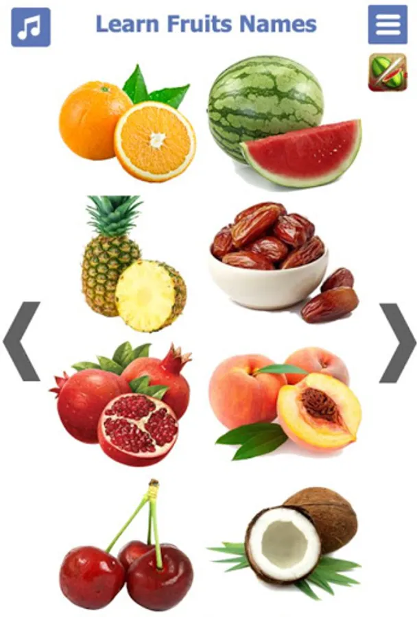 👉 Learning by playing with Fruits game, you can open fruit game by its icon on the top right corner of App.