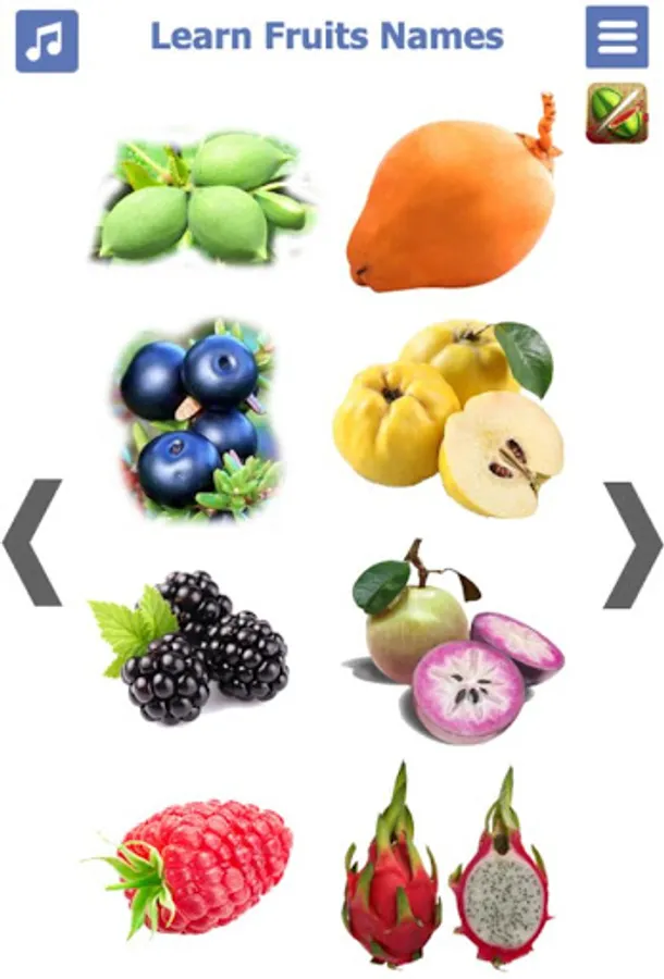 ⭐ You will learn fruits name with picture. You can get five fruits name, 10 fruits name, or 20 fruits name from fruits name list with the right and left scrolls.