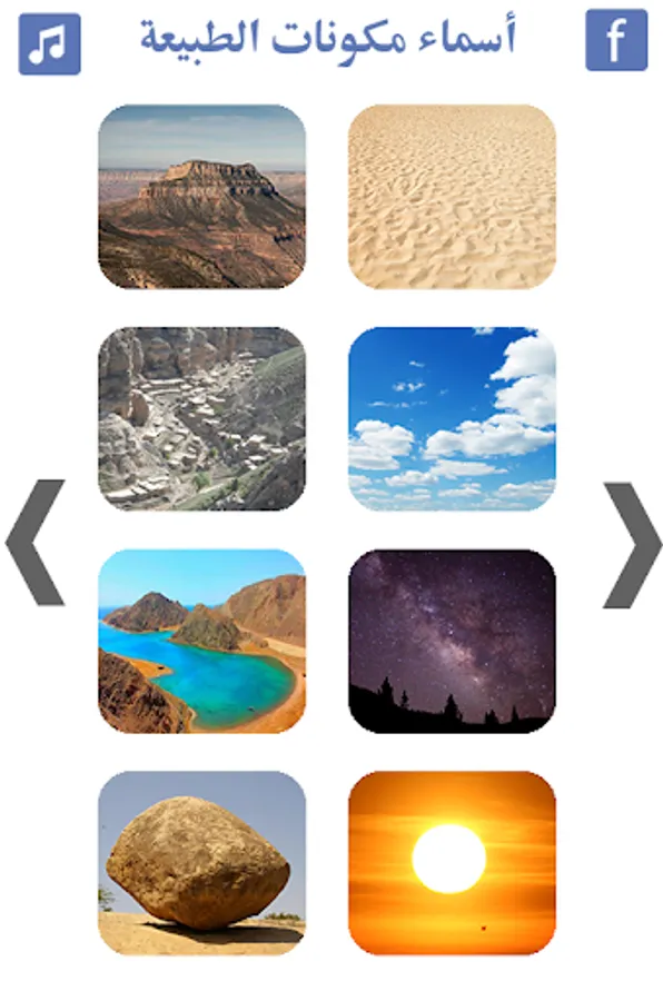 Easy and fun application teaches the child the names of the various components of nature in Arabic by a large list of pictures of nature and picturesque beautiful on the ground or in the sky.