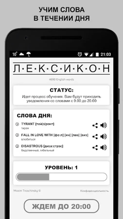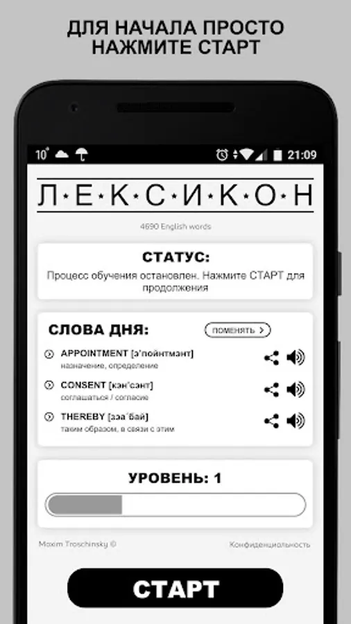 Once you have chosen the word, press the START button. The app will create schedule notifications and every hour from 9.00 to 20.00 you will receive a notice with the word, even if you close the app or restart your phone. Thus, during the day you will come across on the eye these words. It would be better to remember them when you receive a notification, read the word, try to imagine in your mind association with that word and make a small suggestion. Try to use these words in the English classroom. At the end of the day, after 20.00, go to the app, select the following three words, and then press START, that would be that the application to schedule notifications to the next day.